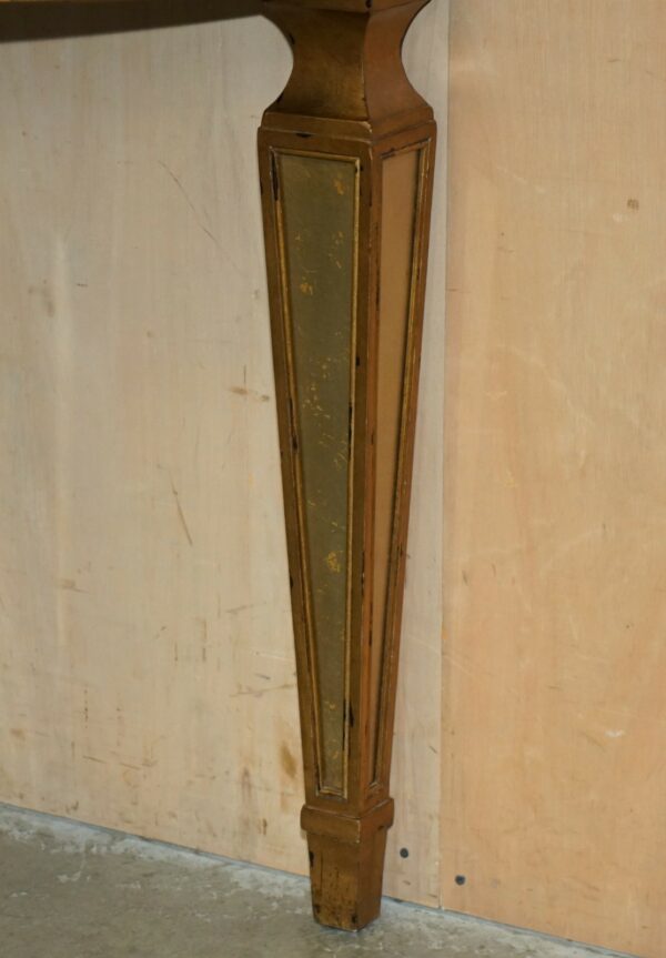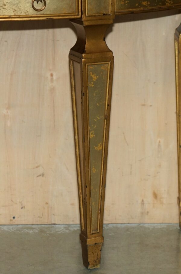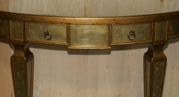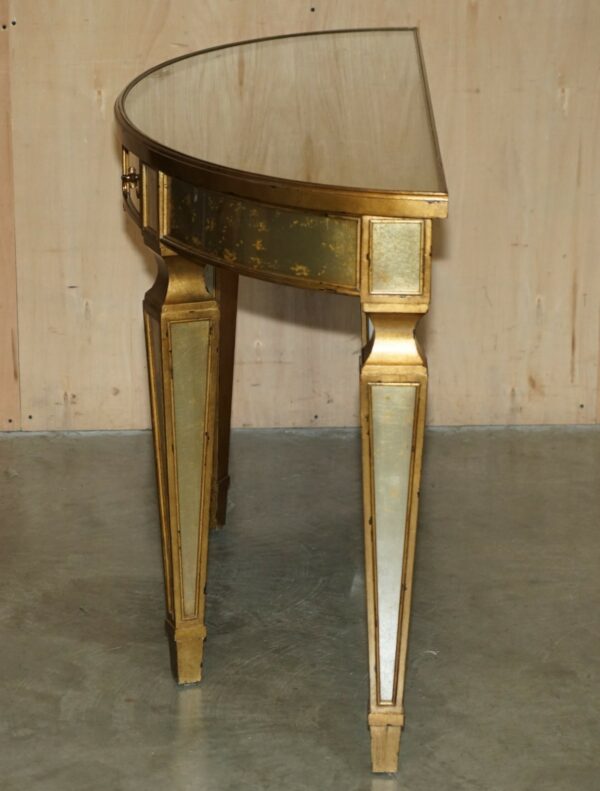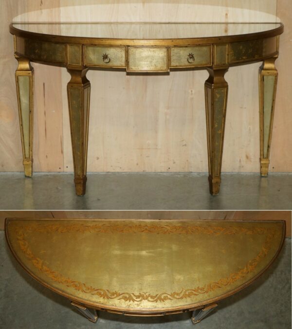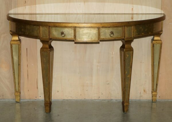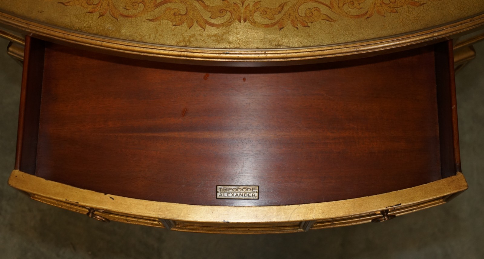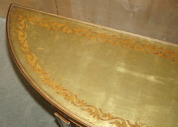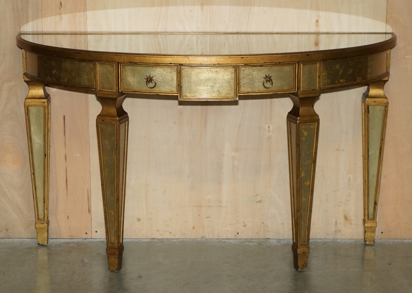 Royal House Antiques is delighted to offer for sale this absolutely stunning original Theodore Alexander Eglomise Demi Lune Console table with one single drawer in a Venitian Gold Gilt finish