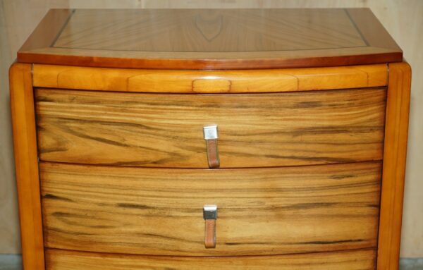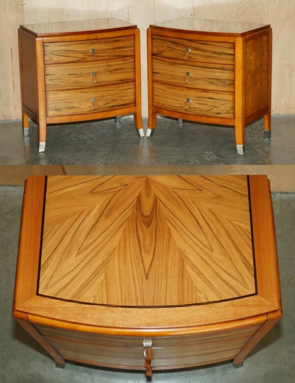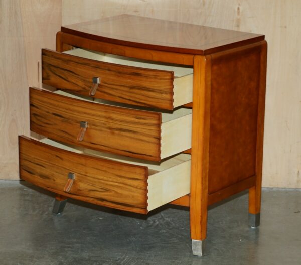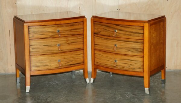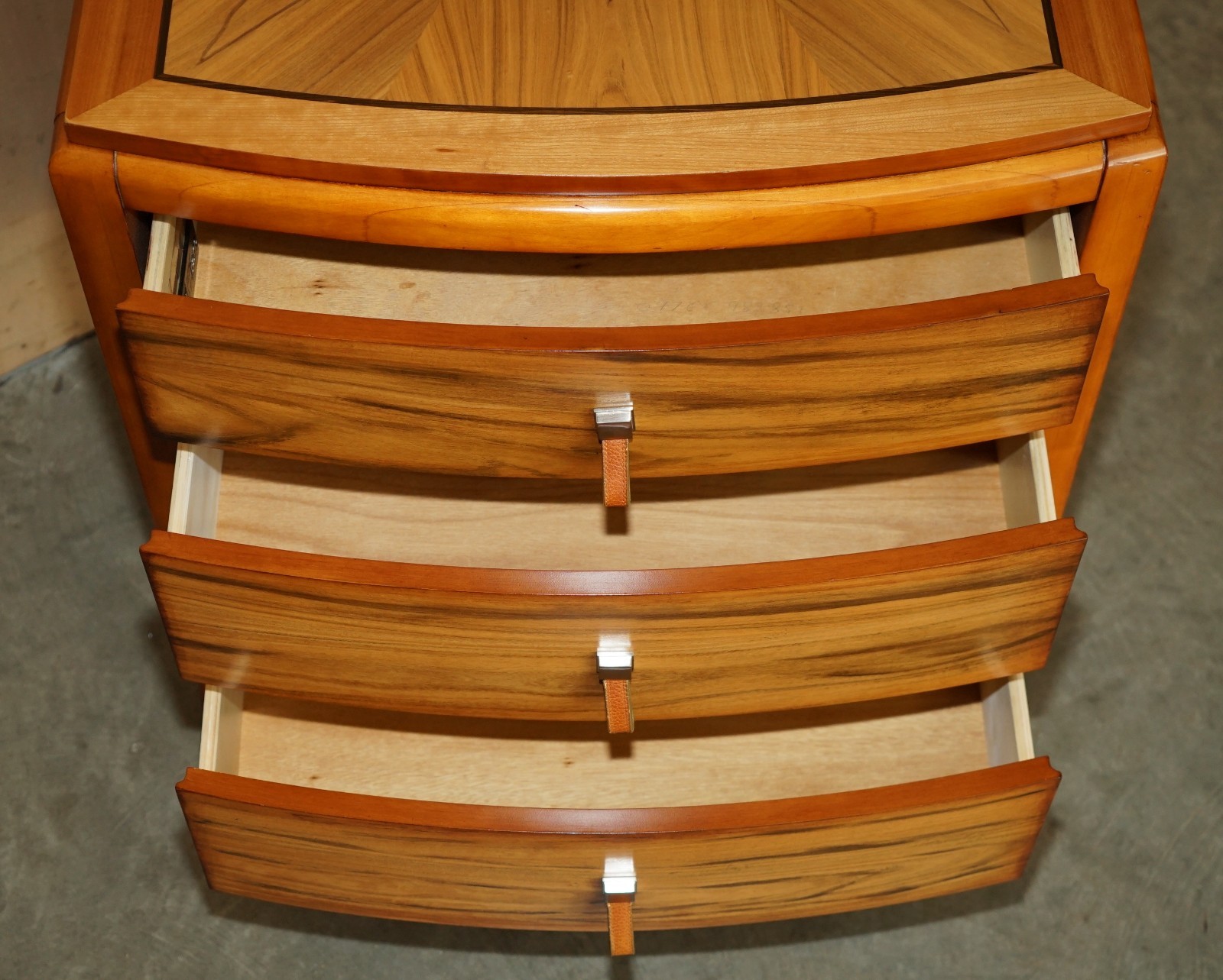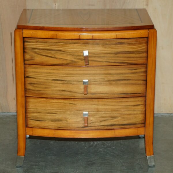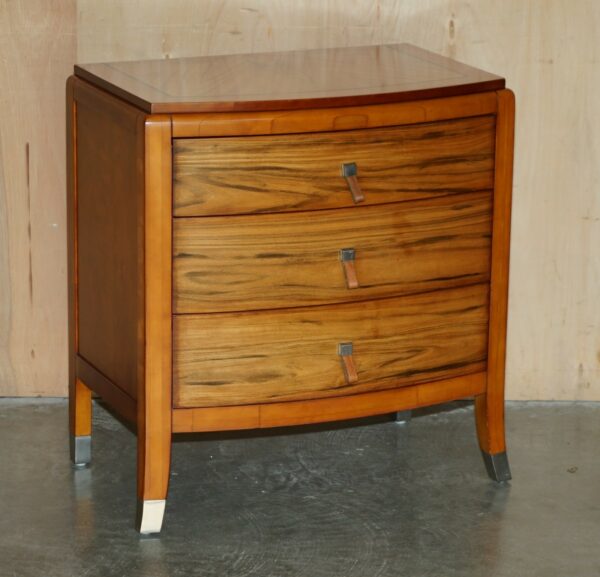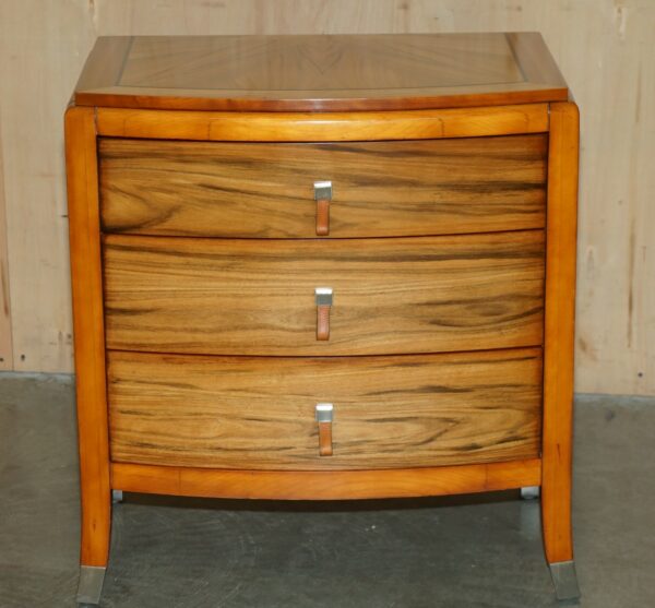 Royal House Antiques is delighted to offer for sale this stunning pair of Robert Idol Designed for Lane Home Furnishings, Walnut & Rosewood night stand or side table sized chest of drawers with Chrome and leather strapped handles which are part of a large suite