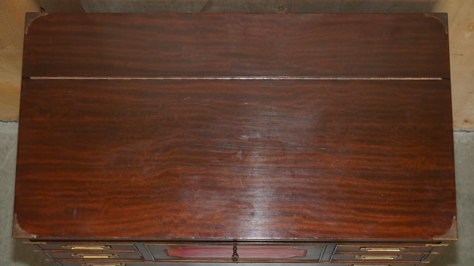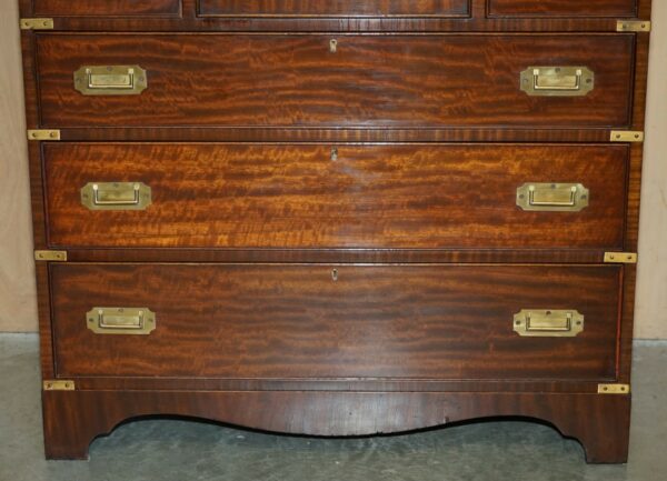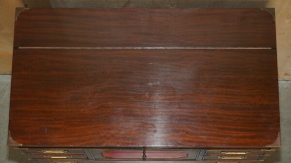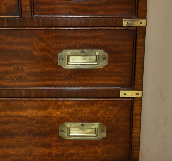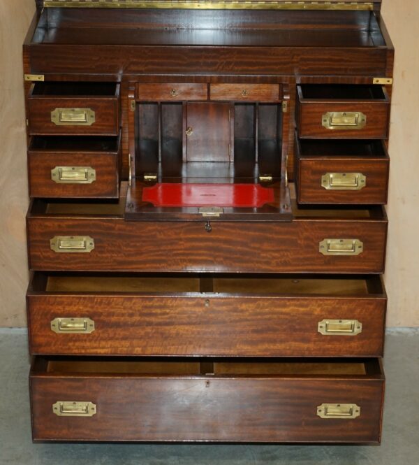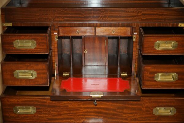 This is a very good looking well made and decorative piece of campaign furniture, this example is very unique as it has the writing slope desk section to the middle and a large thin storage cupboard to the top, this top section would have been used for officers dress gloves, buttons and possible weapons originally, I’ve not seen many of this type