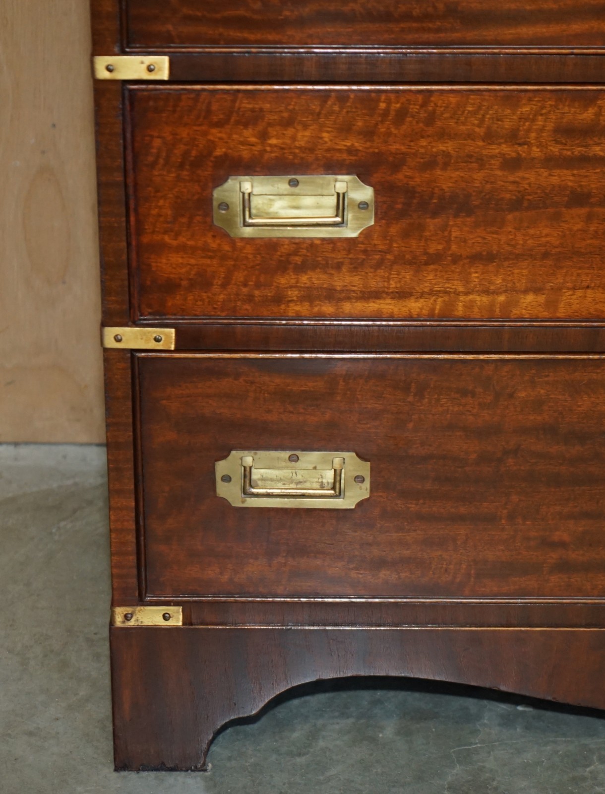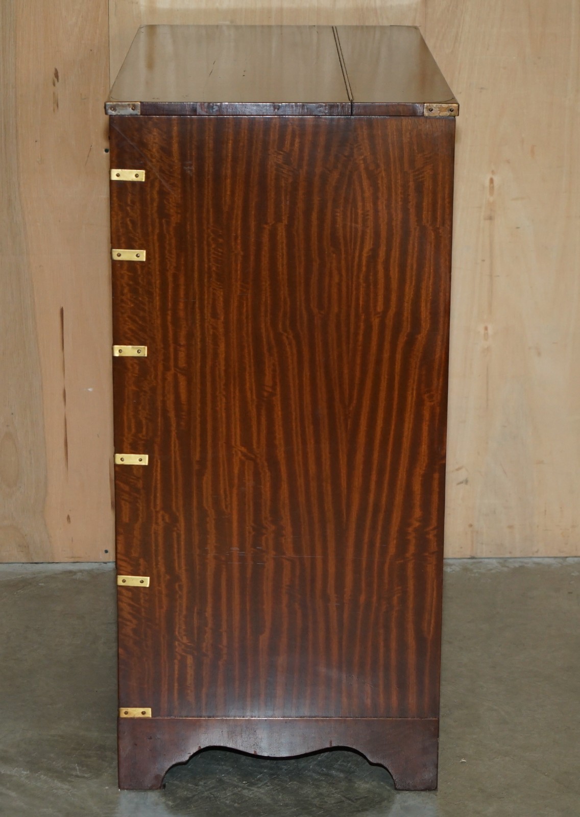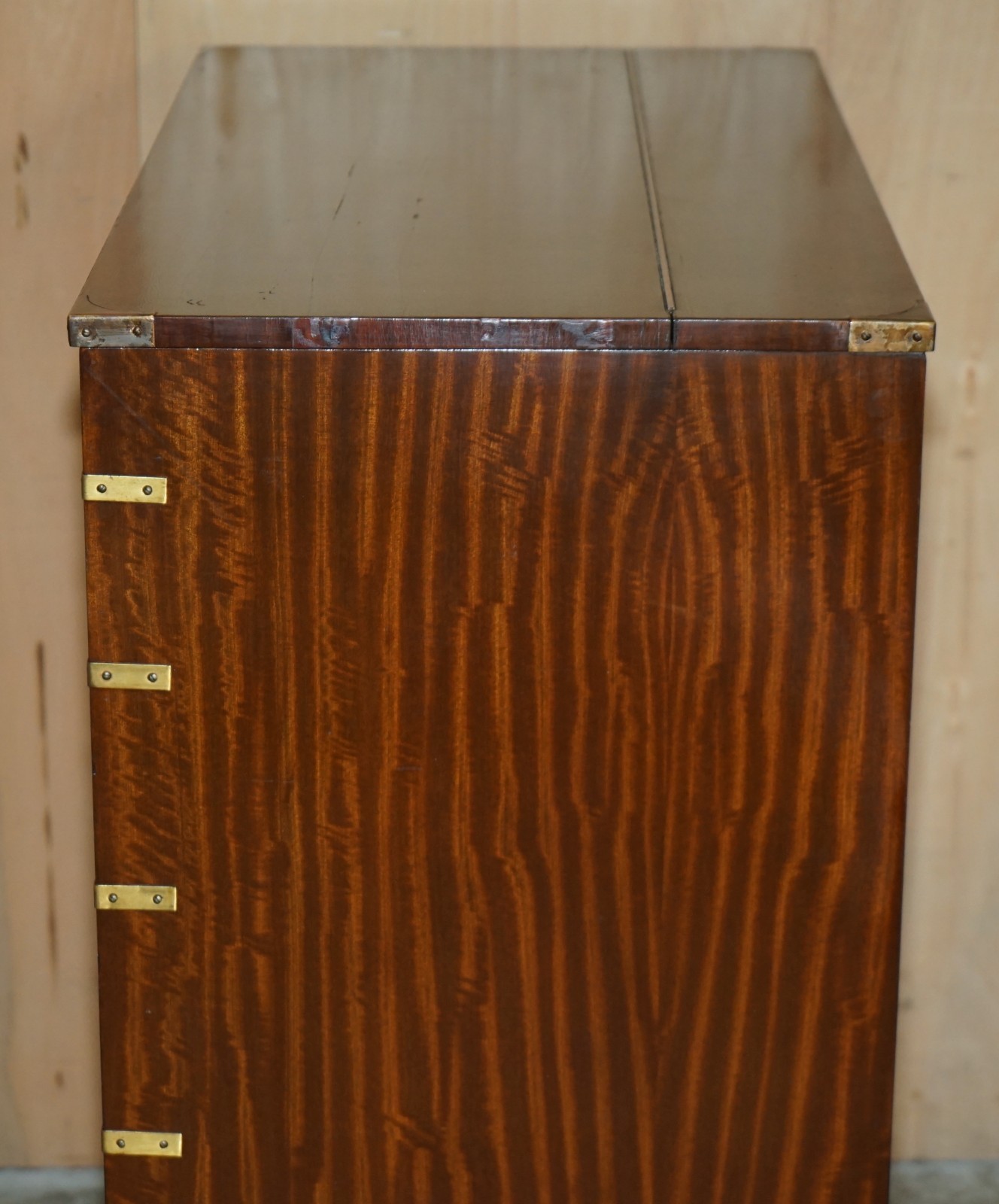 This is a very good looking well made and decorative piece of campaign furniture, this example is very unique as it has the writing slope desk section to the middle and a large thin storage cupboard to the top, this top section would have been used for officers dress gloves, buttons and possible weapons originally, I’ve not seen many of this type