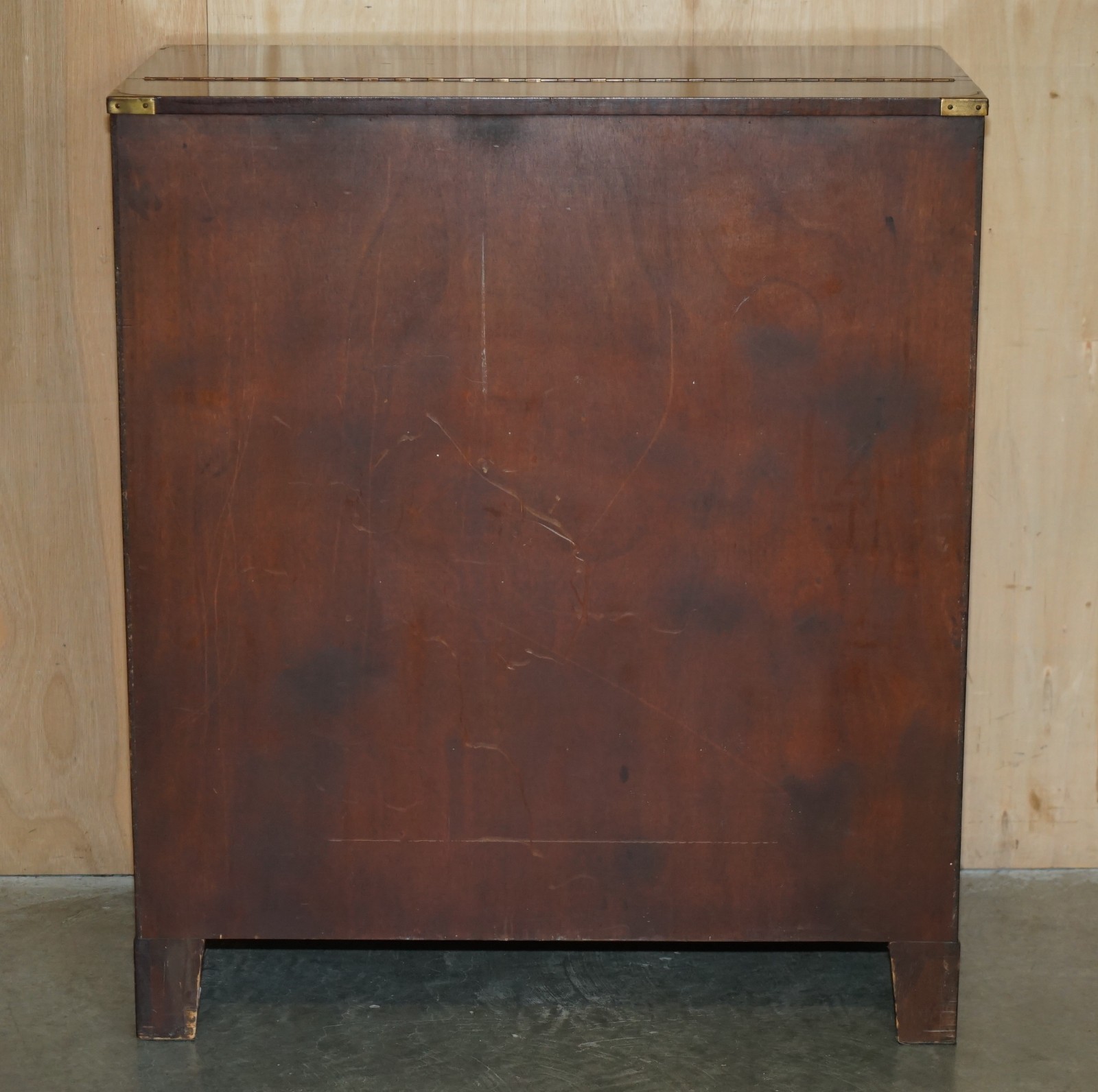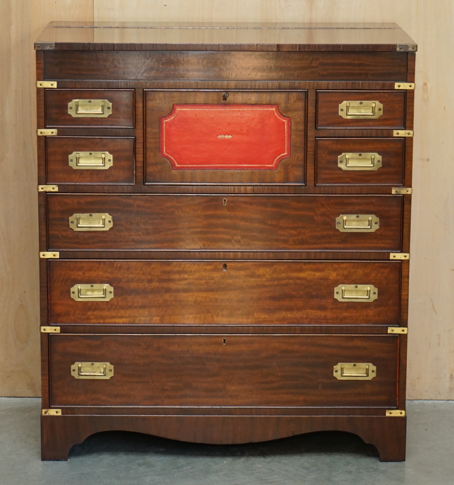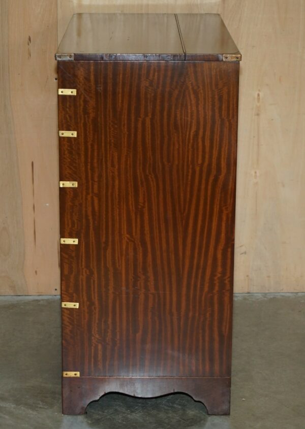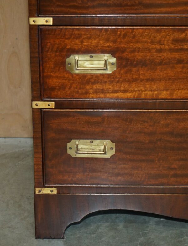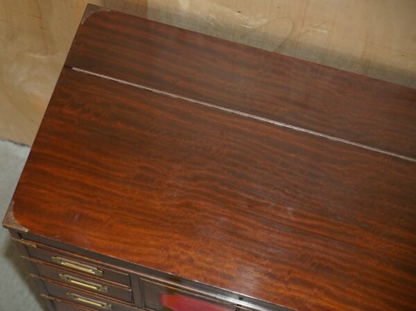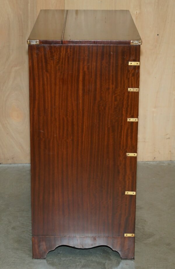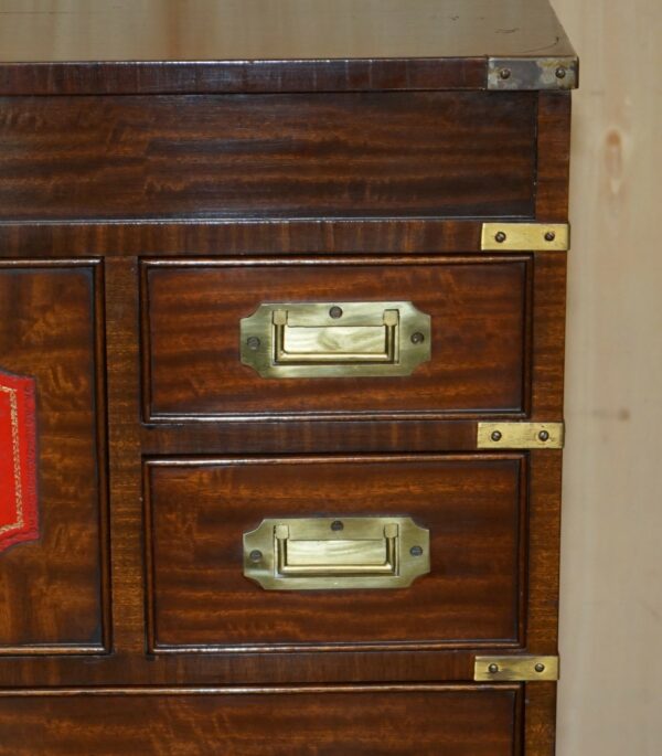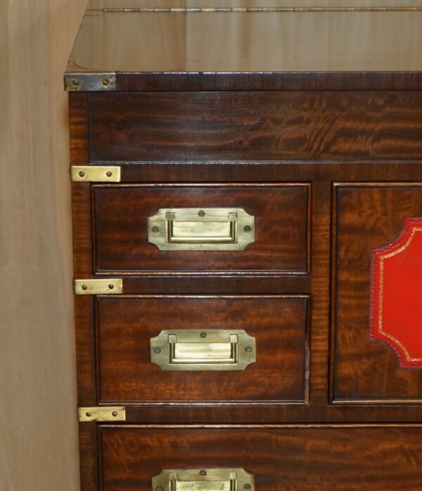 FINE VINTAGE MAHOGANY BRASS & OXBLOOD LEATHER MILITARY CAMPAIGN CHEST OF DRAWERS
