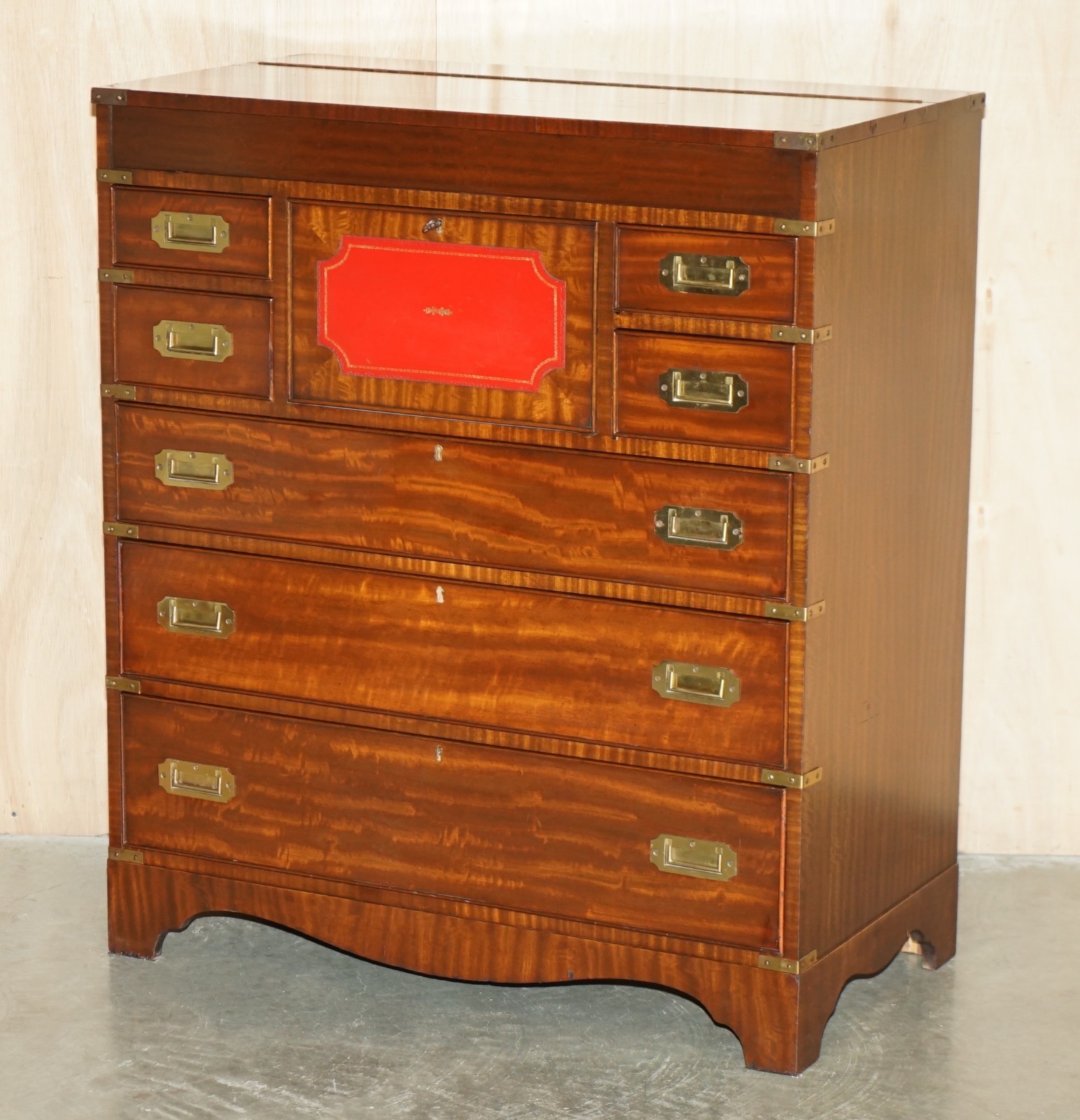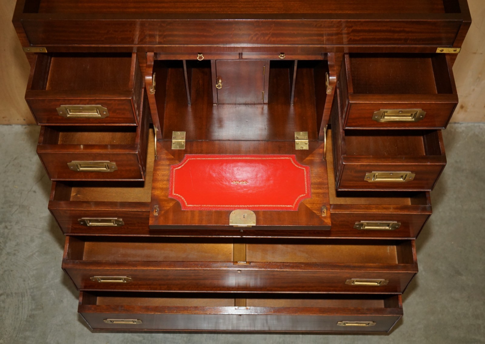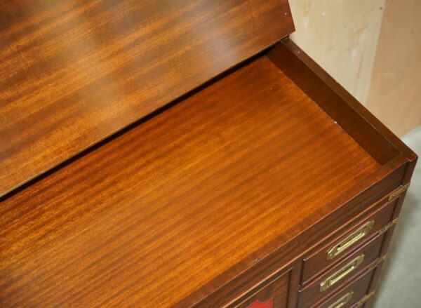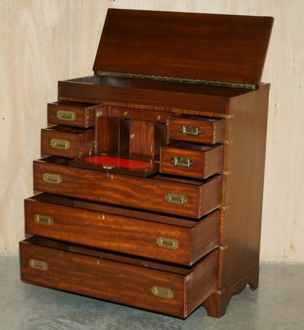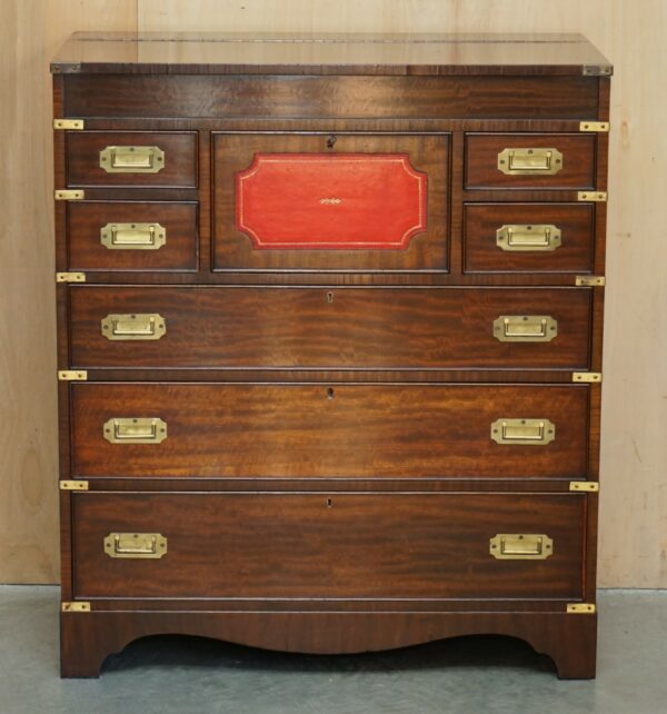 Royal House Antiques is delighted to offer for sale this lovely mid century circa 1960’s Military Campaign chest of drawers in Mahogany with English Brass fittings and Oxblood leather writing slope