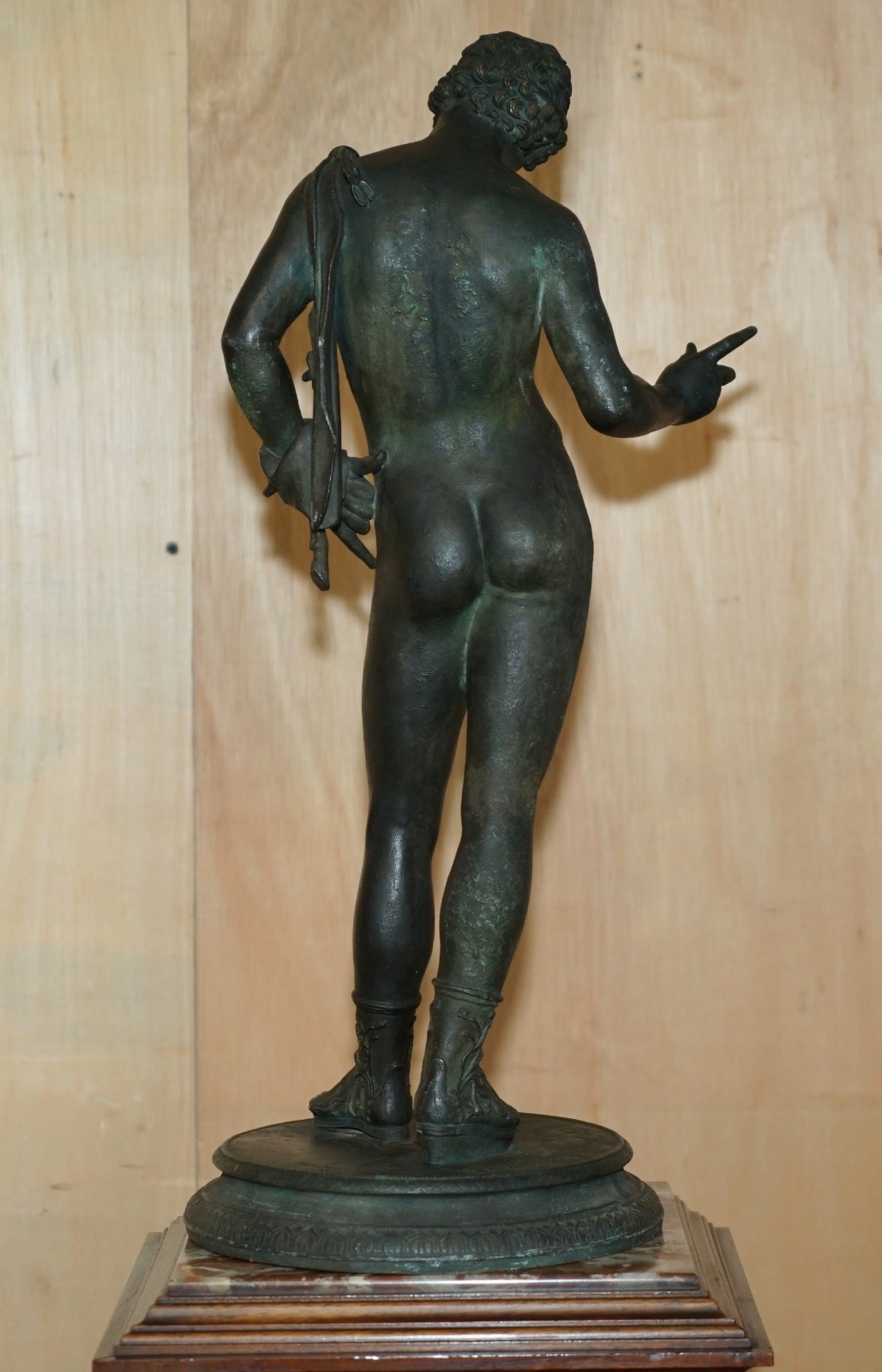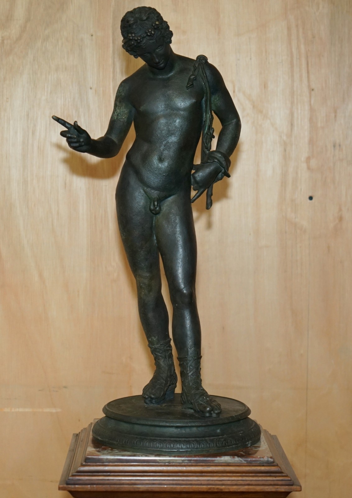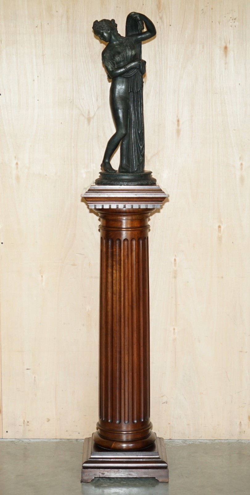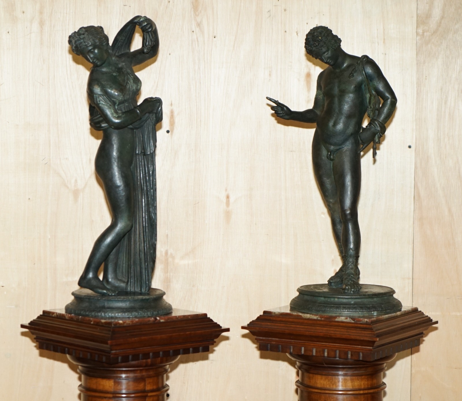 Royal House Antiques is delighted to offer for sale this museum quality pair of Sommer Foundry Naples Verdigris Bronze statues of Narcissus & Venus Callipygian seated on Marble topped, Mahogany carved Corinthian pillars as displayed in the National Trust