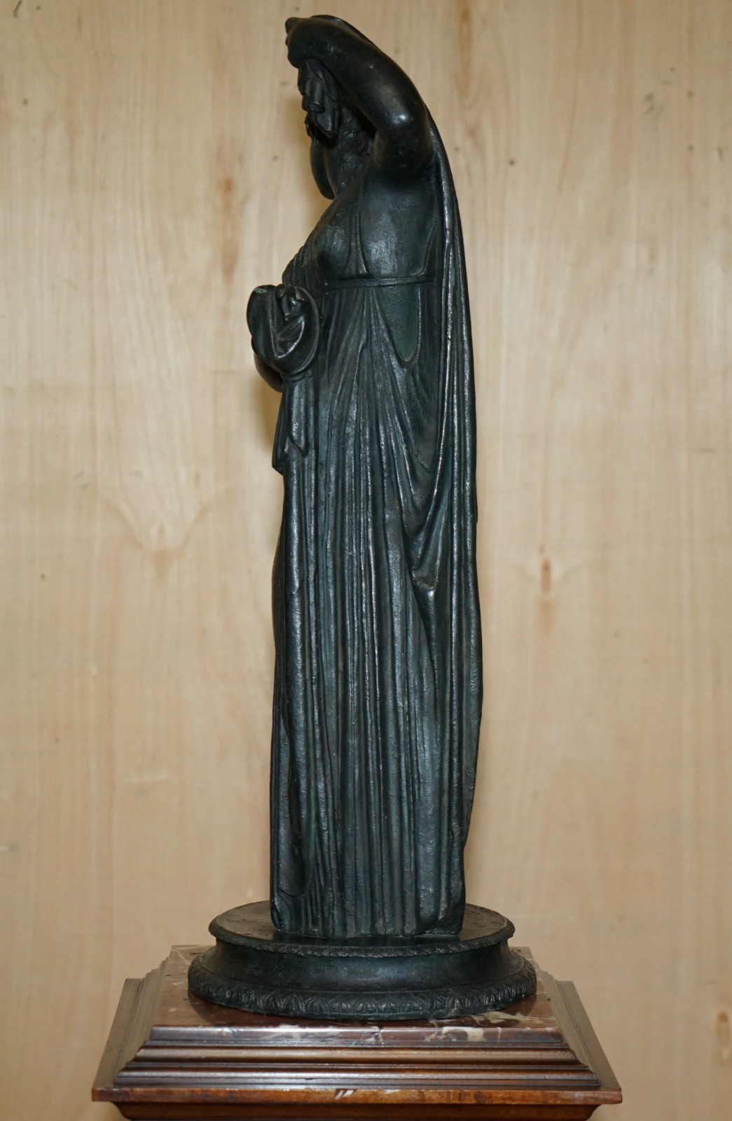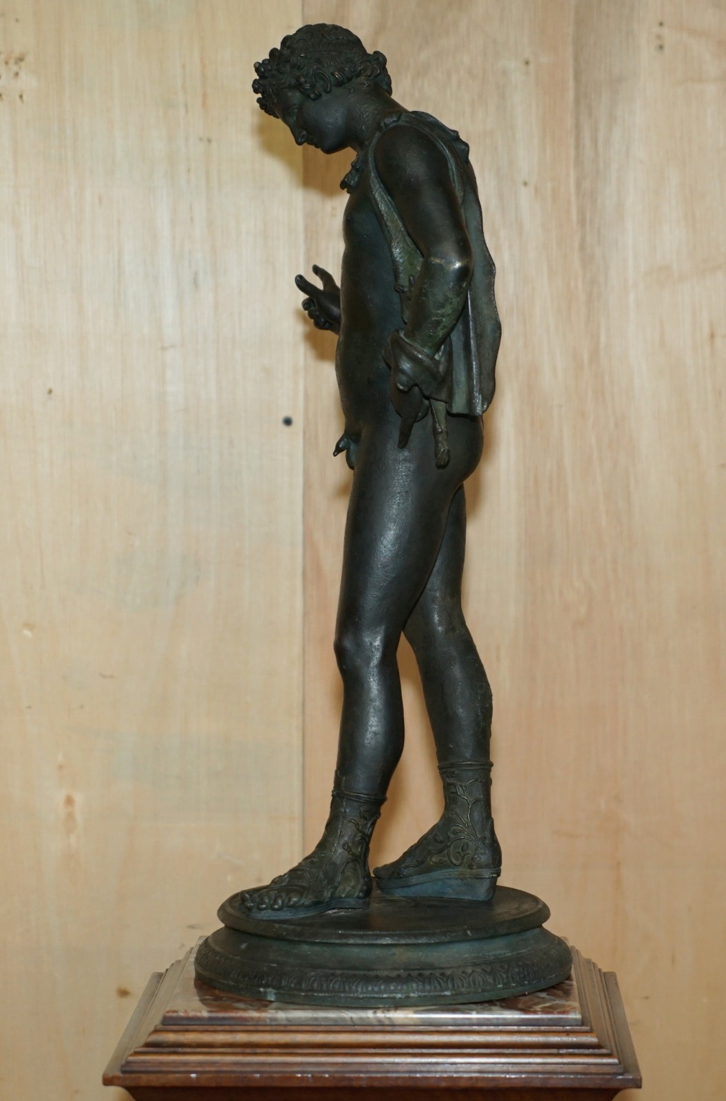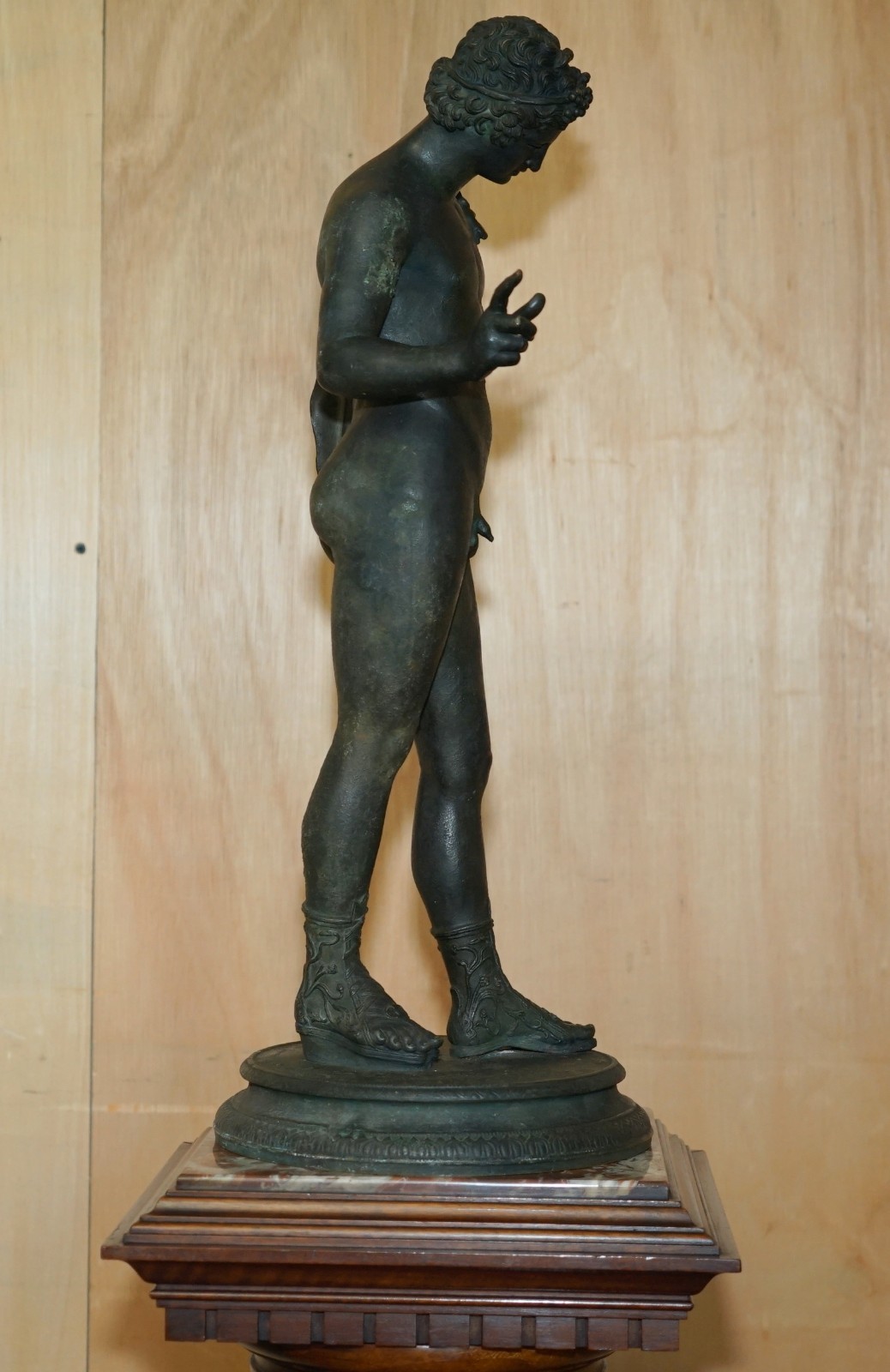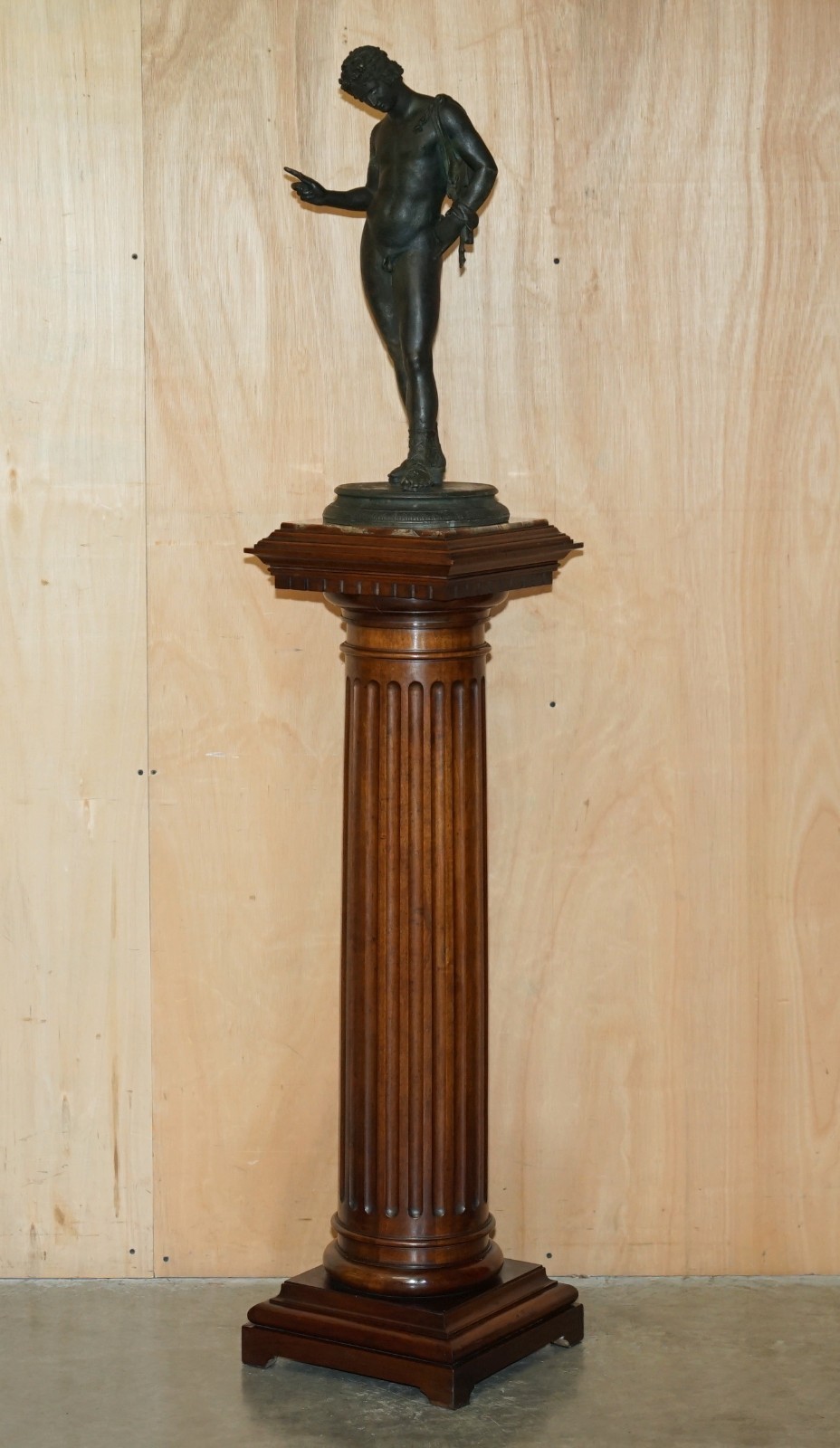 Royal House Antiques is delighted to offer for sale this museum quality pair of Sommer Foundry Naples Verdigris Bronze statues of Narcissus & Venus Callipygian seated on Marble topped, Mahogany carved Corinthian pillars as displayed in the National Trust