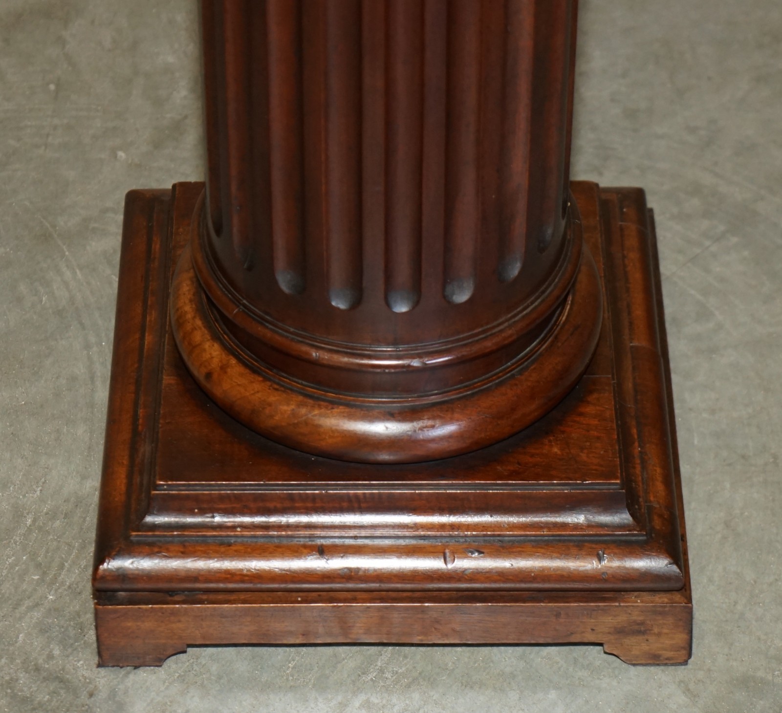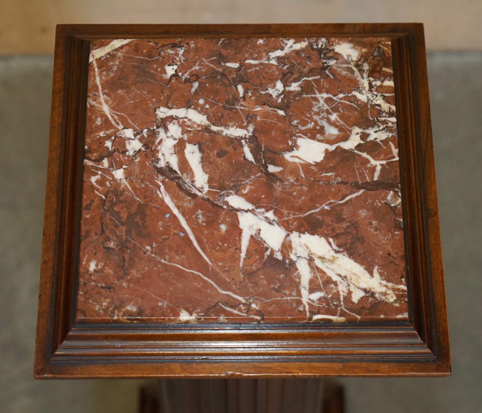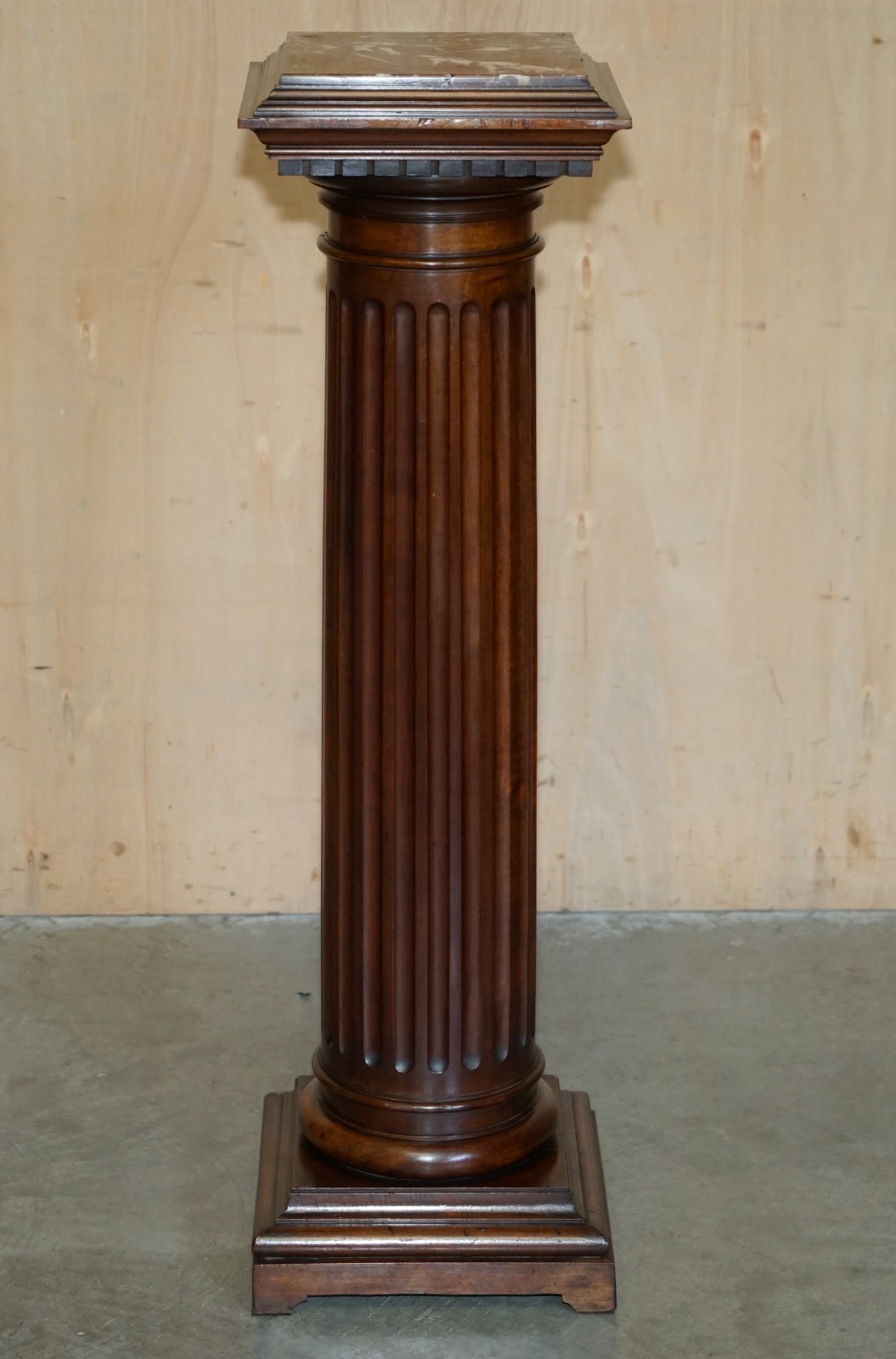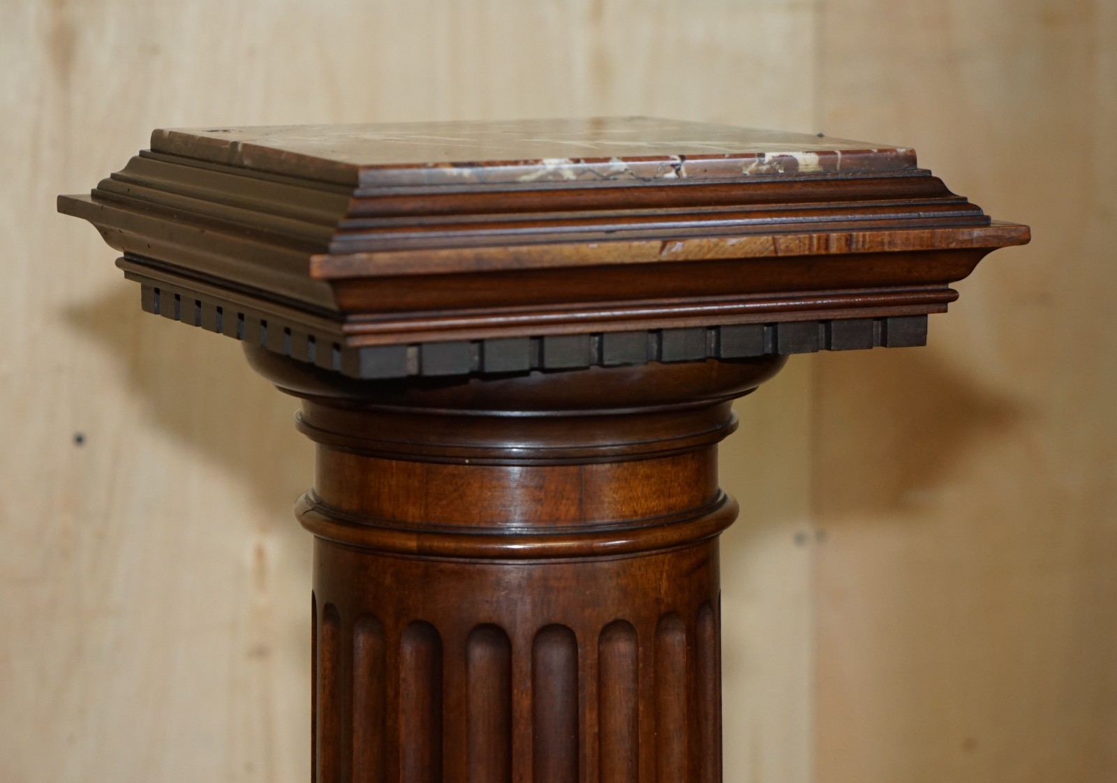 Royal House Antiques is delighted to offer for sale this museum quality pair of Sommer Foundry Naples Verdigris Bronze statues of Narcissus & Venus Callipygian seated on Marble topped, Mahogany carved Corinthian pillars as displayed in the National Trust