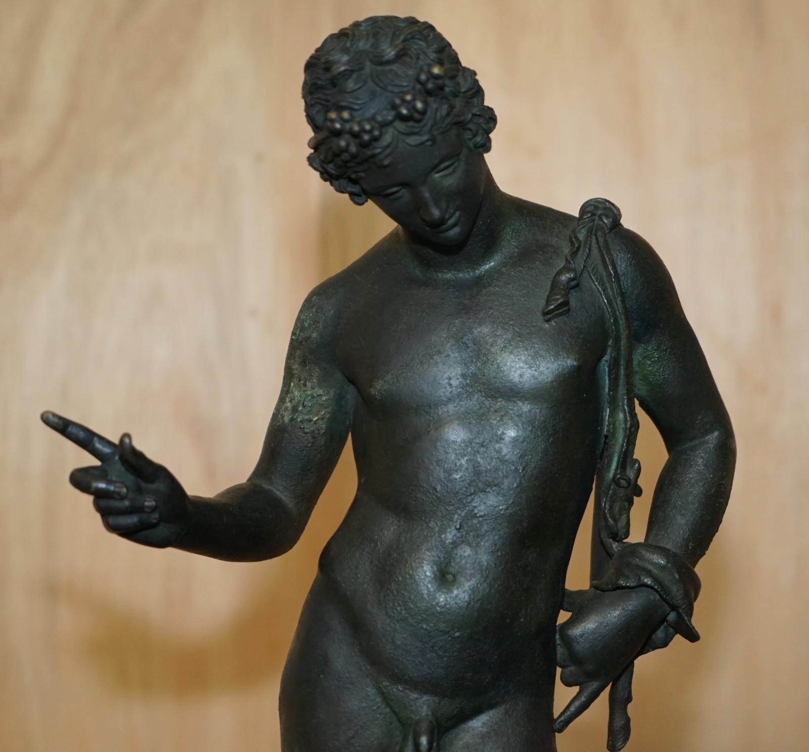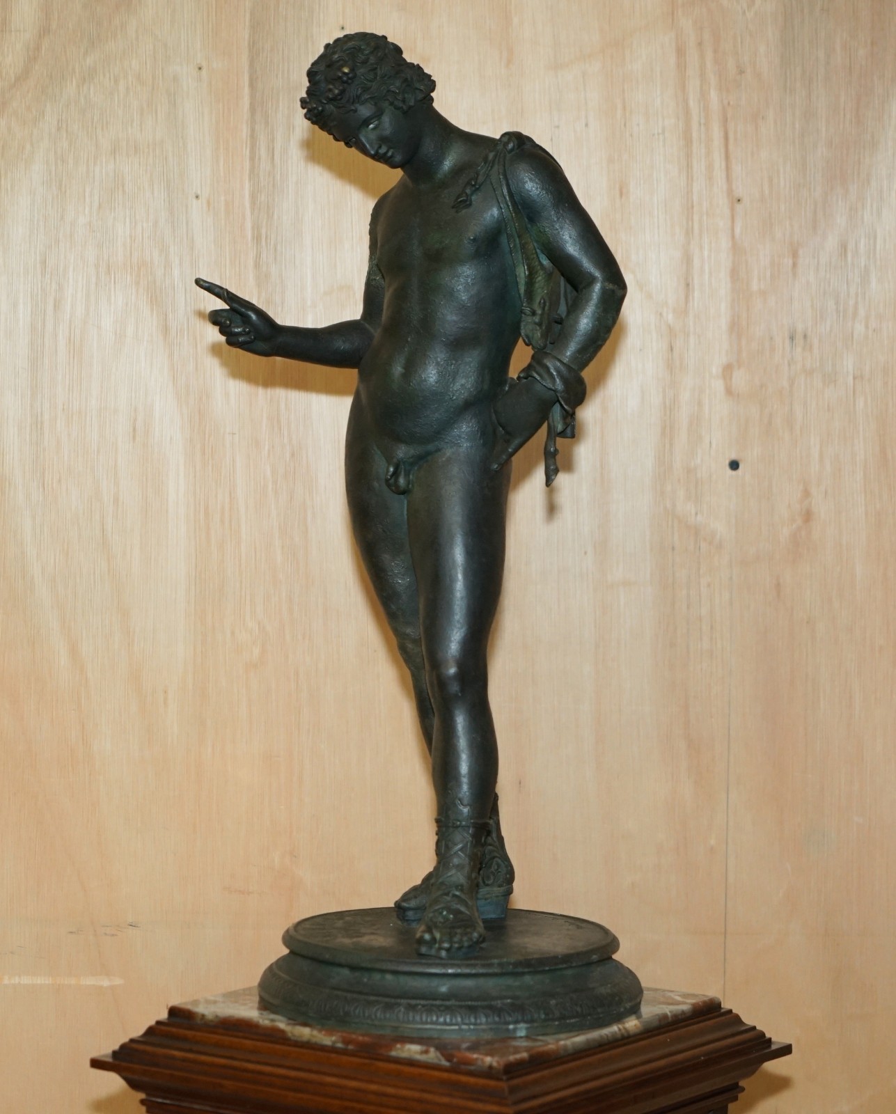 The bronze figure of Narcissus was unearthed in 1862 during excavations at Pompeii and is now housed in the Museo Nazionale in Naples. It is identified by his contemplative gaze which is likely directed at his own reflection and the gesture of his raised hand. The cast of the nude youth was depicted with a goat skin and an ivy wreath, blending naturalistic detail with idealized form. In the 19th century, the figure inspired numerous productions, particularly among Grand Tour travelers and was cast extensively by all three major Neapolitan foundries.