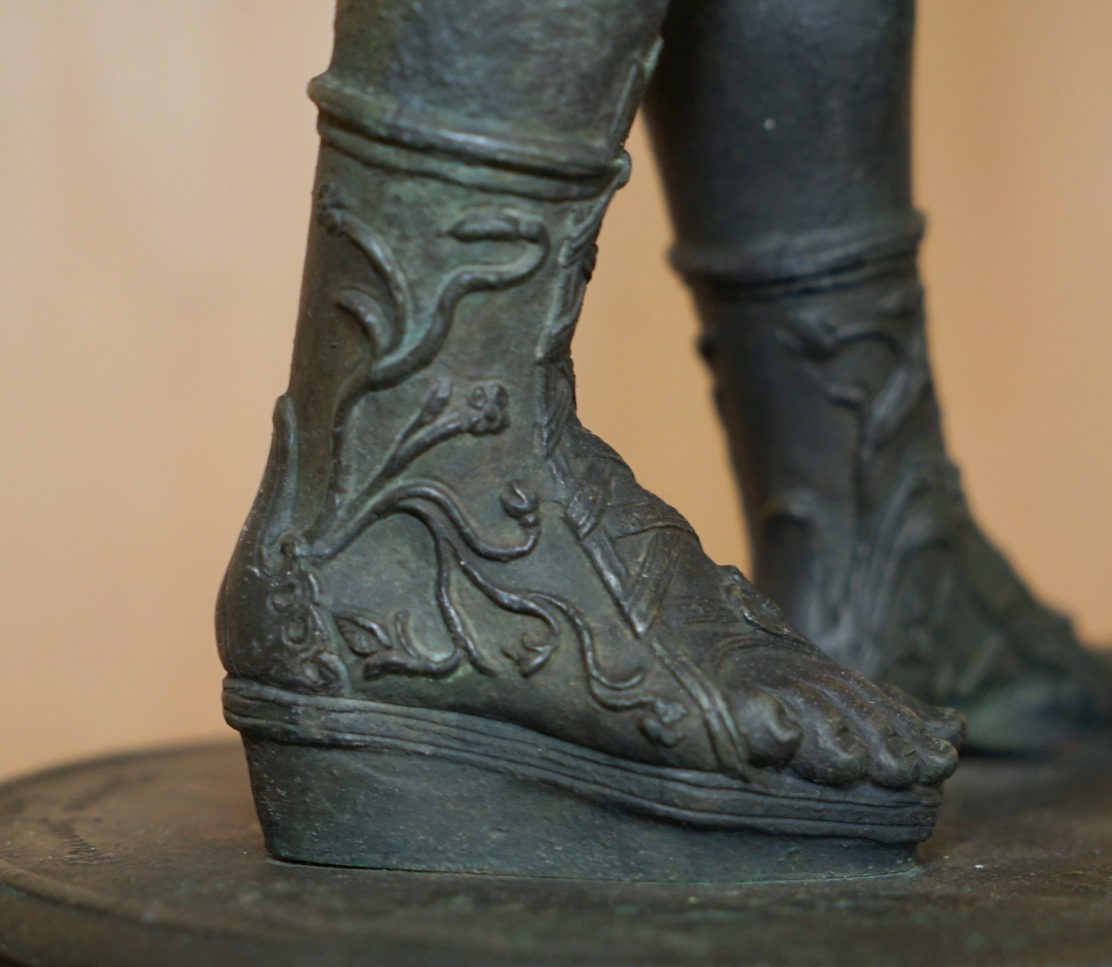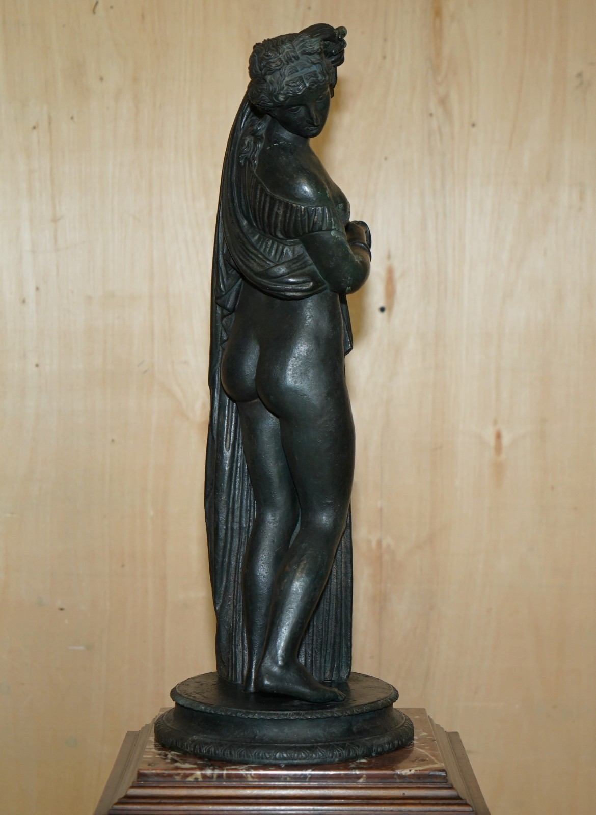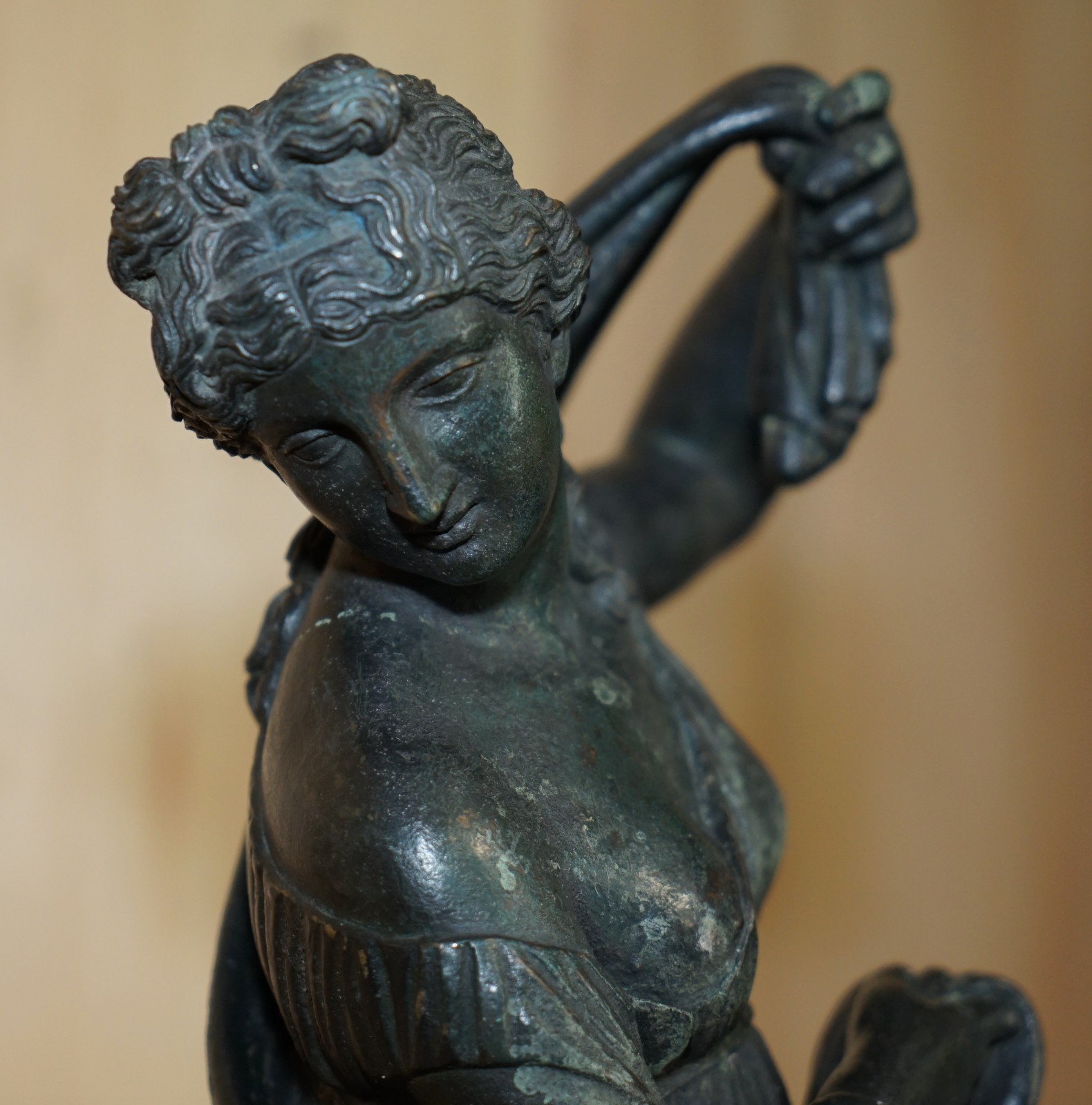 The surface throughout is characterized by perfection: smooth and exquisitely finished garments and skin all finished in a medium-brown translucent patina. The model depicts the Callipygian Venus, also known as the Venus Kallipygos or the Aphrodite Kallipygos. The term “Callipygian” is derived from the Greek words “kallos” meaning beautiful, and “pyge” meaning buttocks.