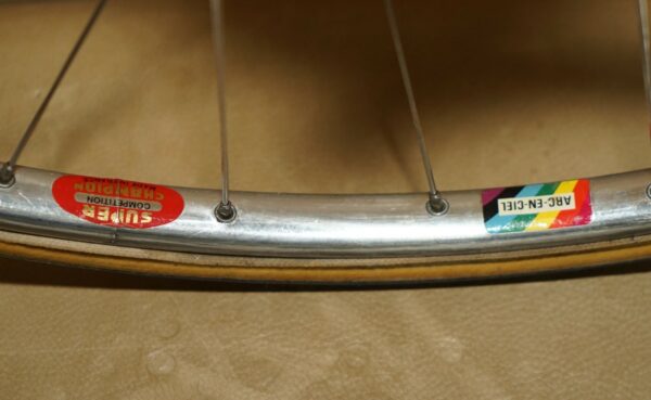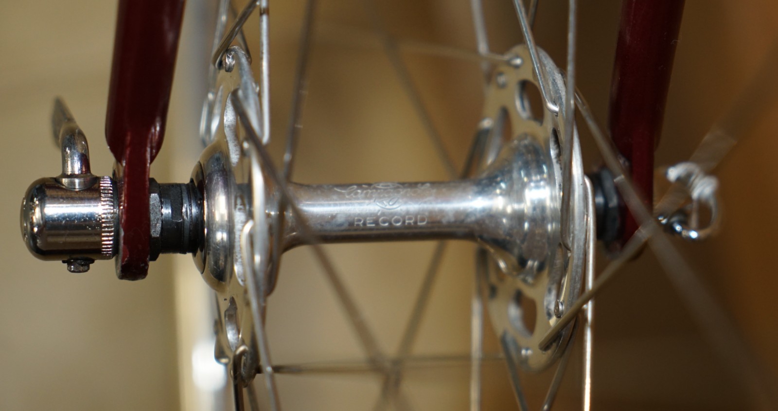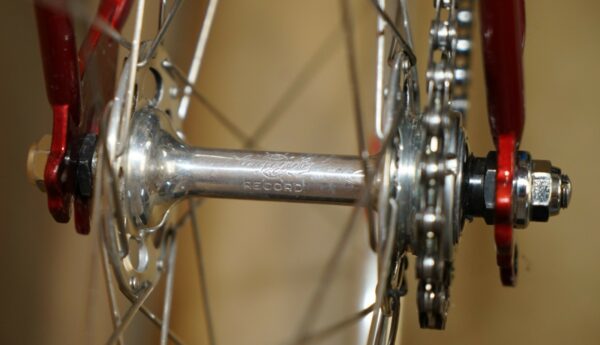 Wheelset:- Hubs Campagnolo Record large flange track hubs with a Surley 18t fixed sprocket. Rims Super Competition Champion made in France Arc-En-Ciel, Spokes 28 front and rear, the wheels are tubular so they take tubs
