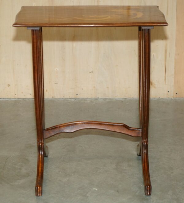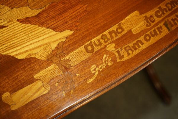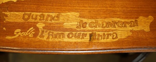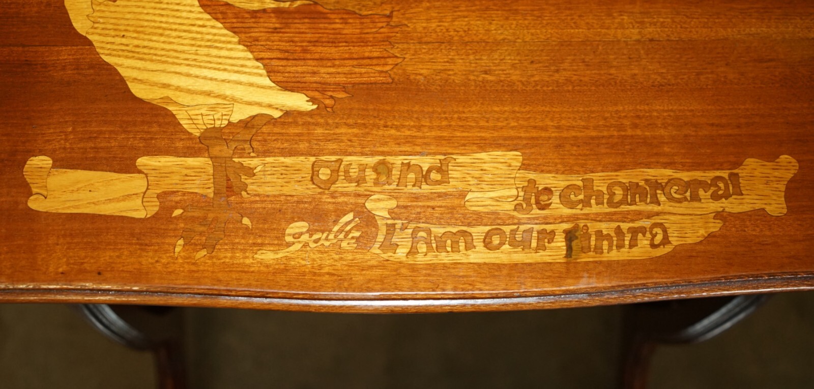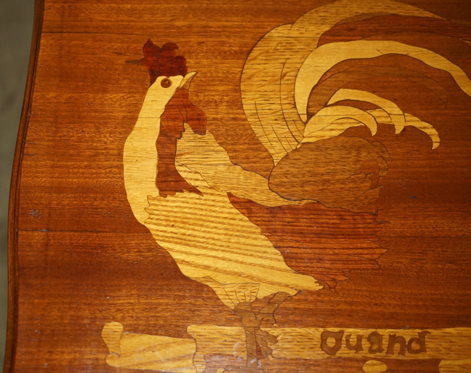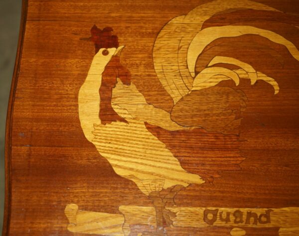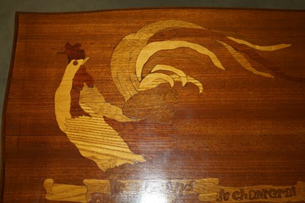 Royal House Antiques is delighted to offer for sale this exceptionally rare Emile Galle signed occasional table with sample wood top depicting a Rooster and a quote reading “Quand je chanterai l’Amour finira” in French which translates to “When I sing, Love will end”