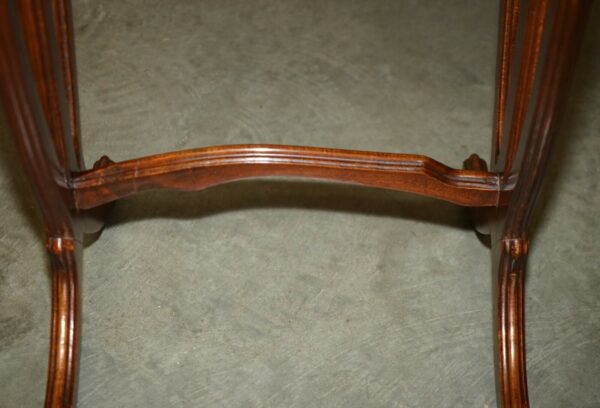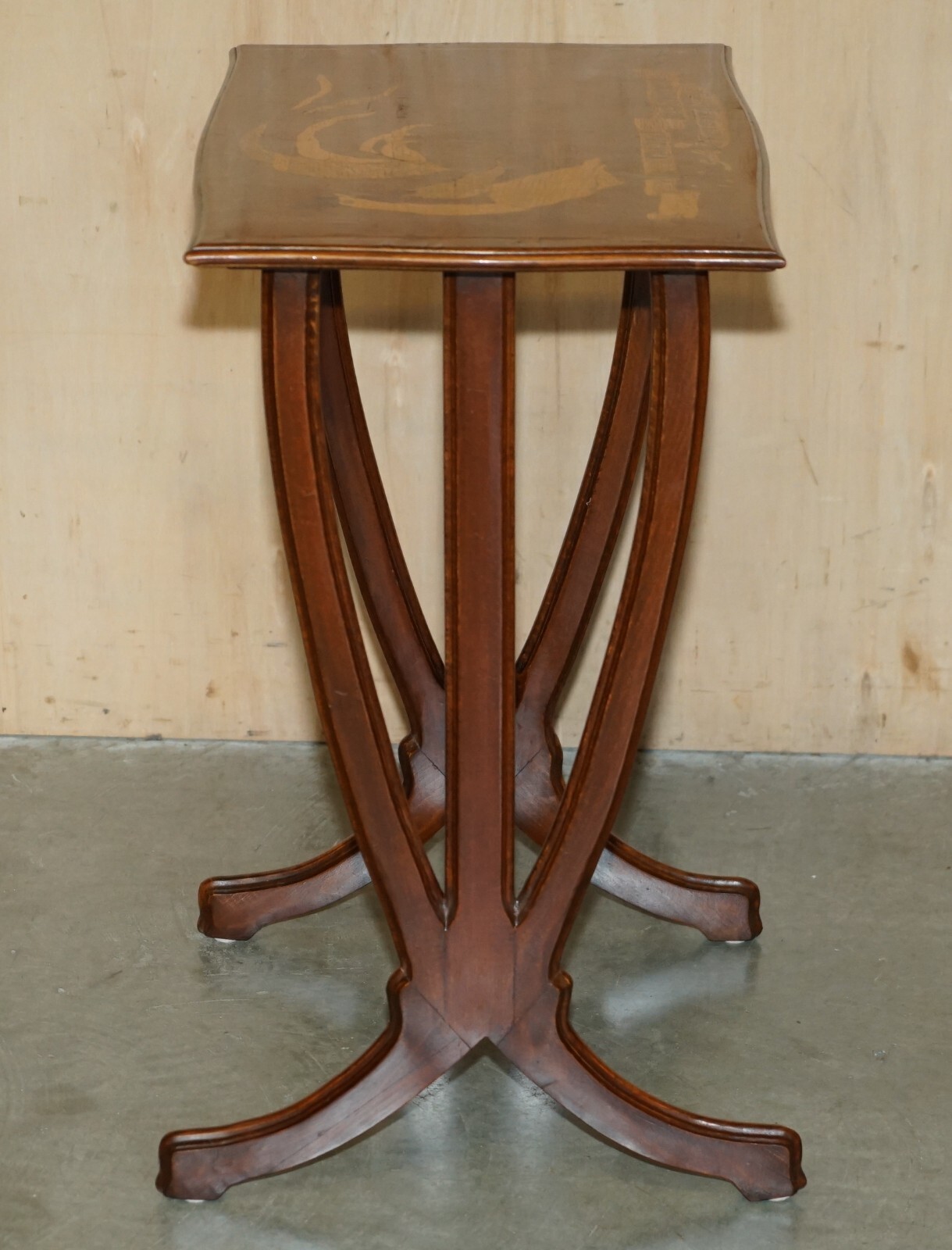 This table has a beautiful Art Nouveau base, the top is inlaid with all very rare cuts of sample wood, signed to the bottom left, Galle