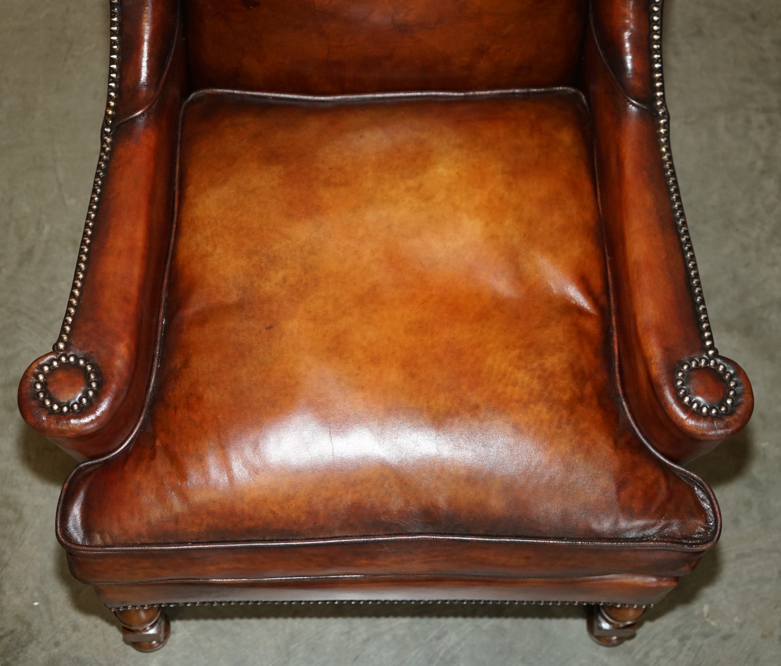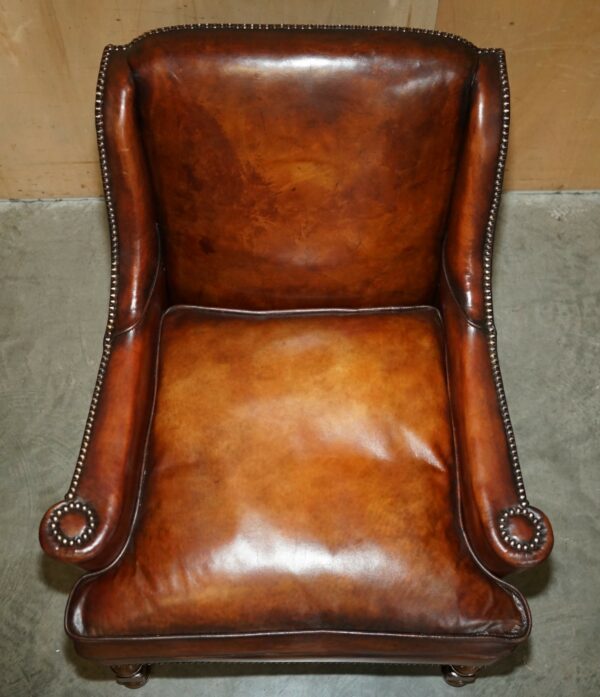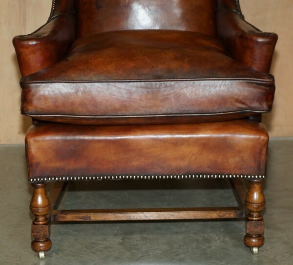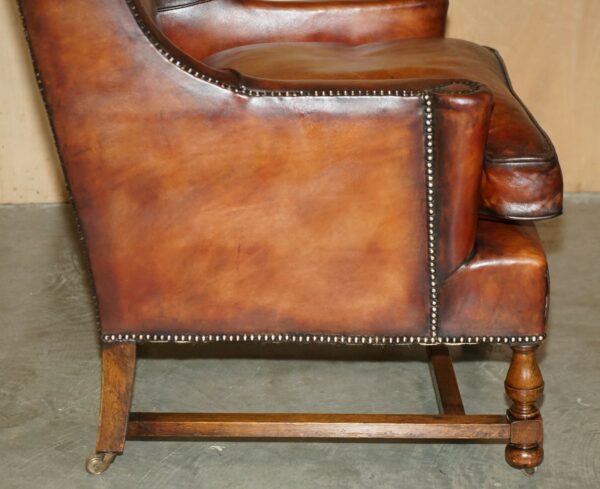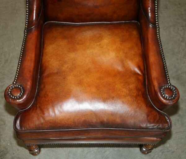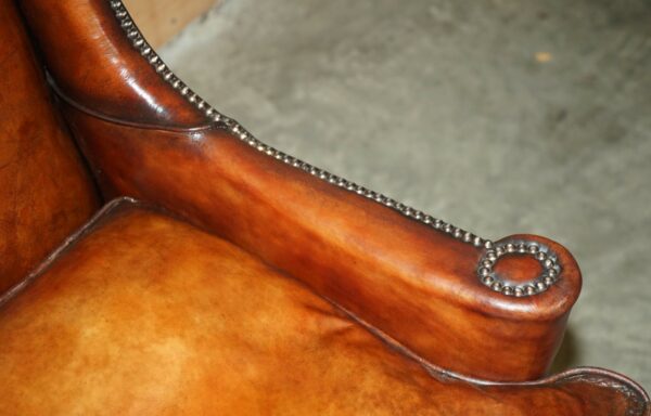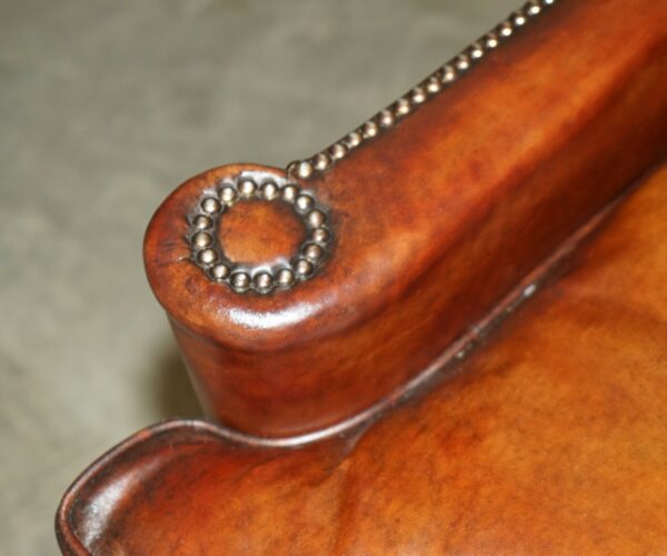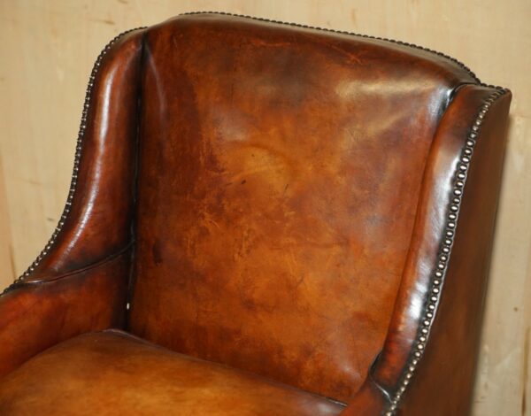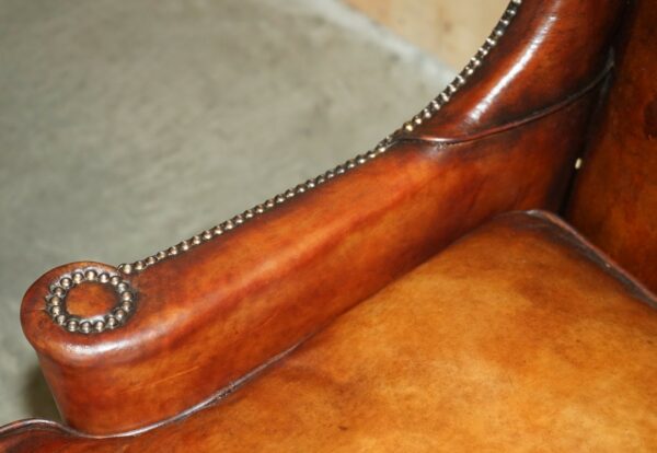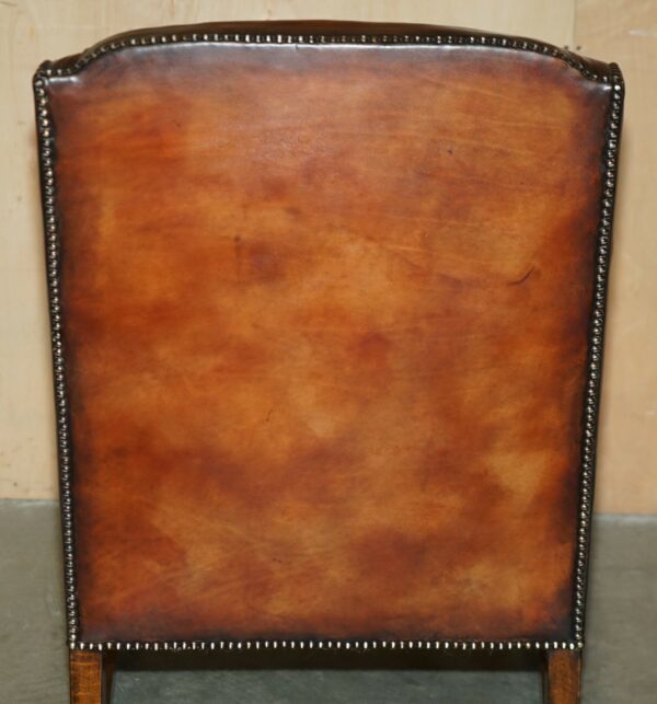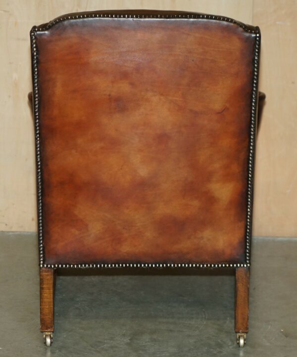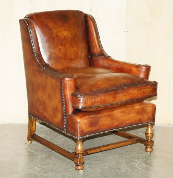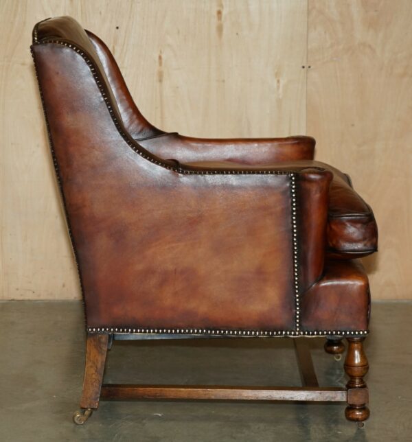 As mentioned, the chair has been fully restored, almost all the leather is new premium Italian fully Aniline hide, its upholstered plain then hand dyed six times, antiqued, sealed waxed down and polished, this was the traditional method of dying leather in the early 19th century