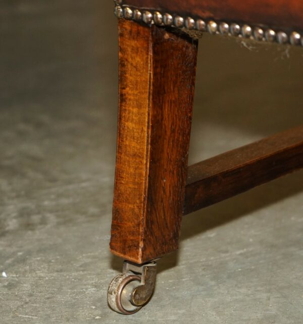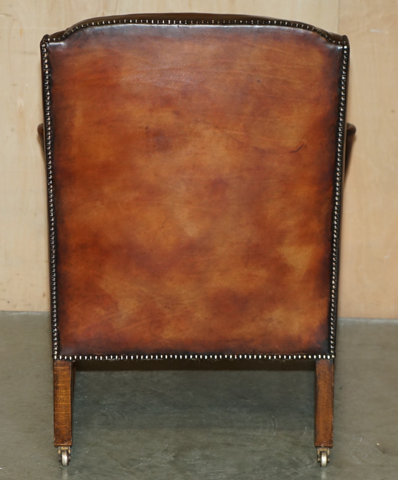 Royal House Antiques is delighted to offer for sale this very unique circa 1830-1840 fully restored English oak and had dyed brown leather William Morris Library reading armchair with period castors