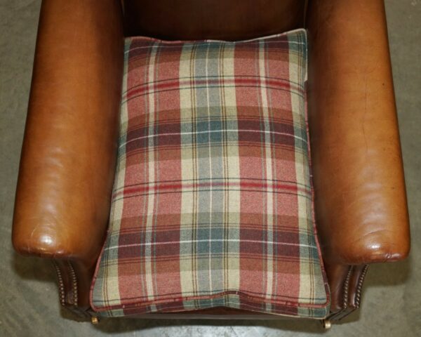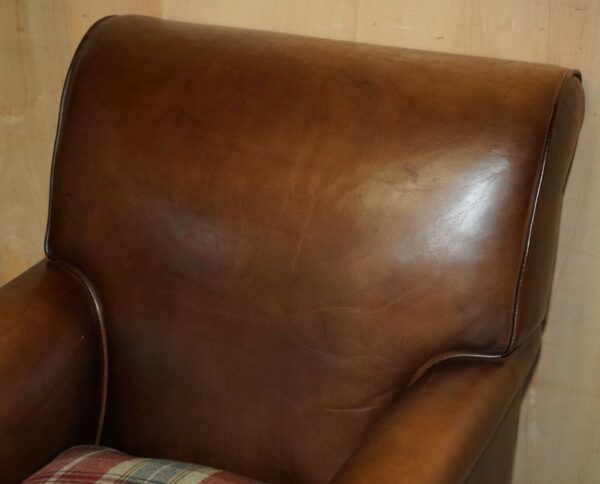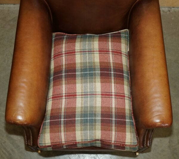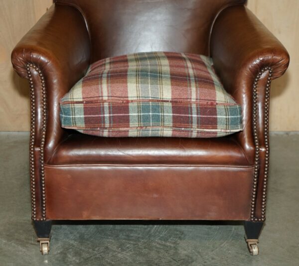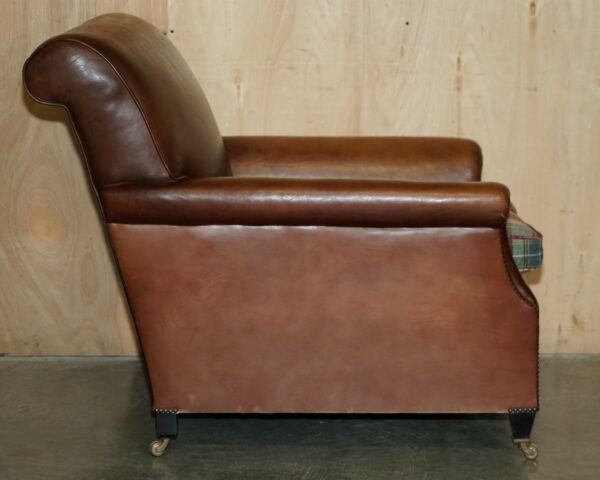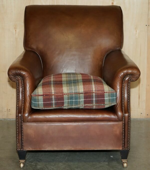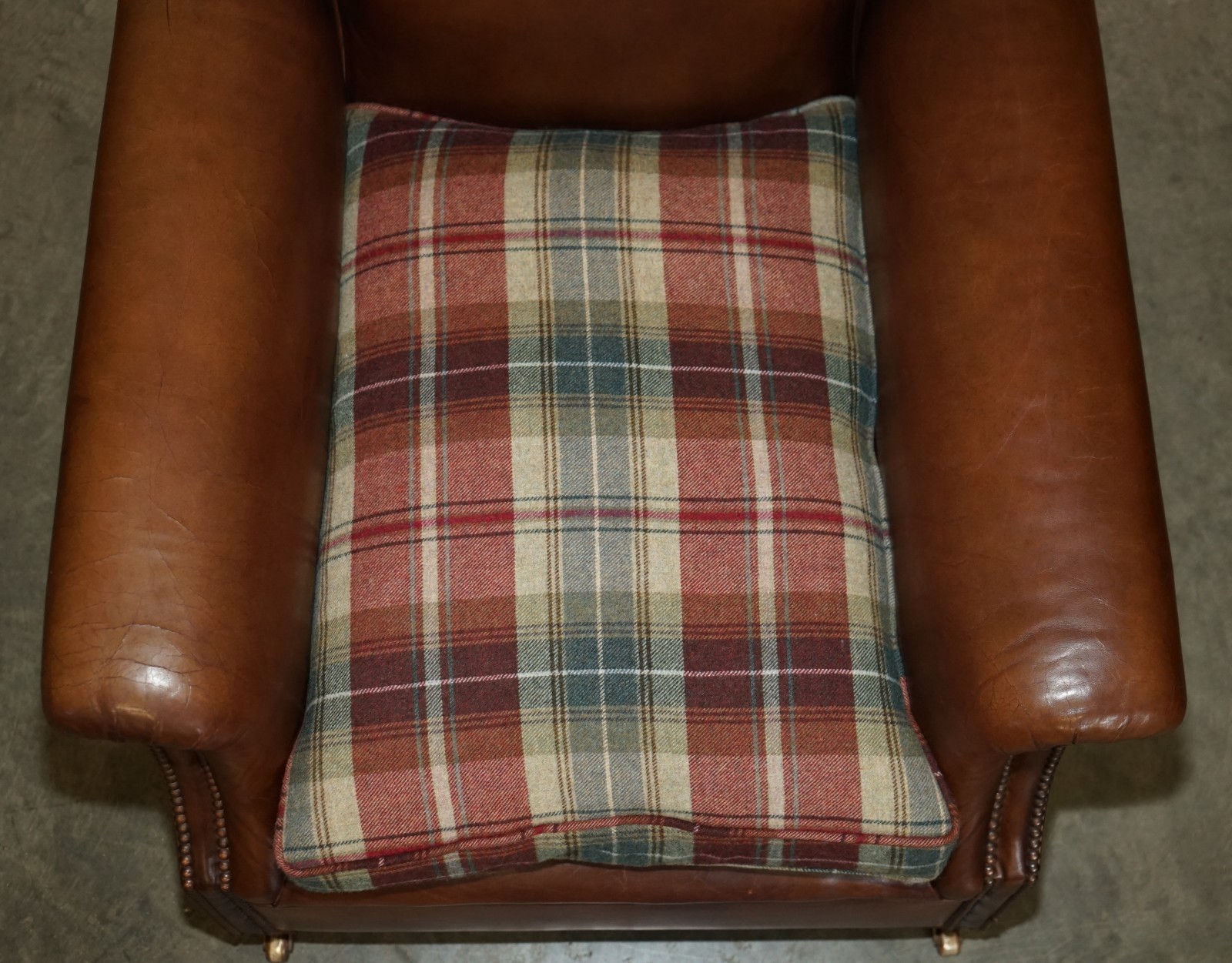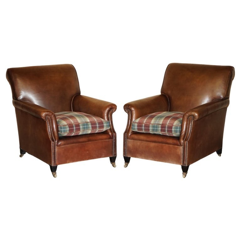 PAIR OF GEORGE SMITH BROWN LEATHER SIGNATURE SCROLL TARTAN CUSHIONS ARMCHAIRS
