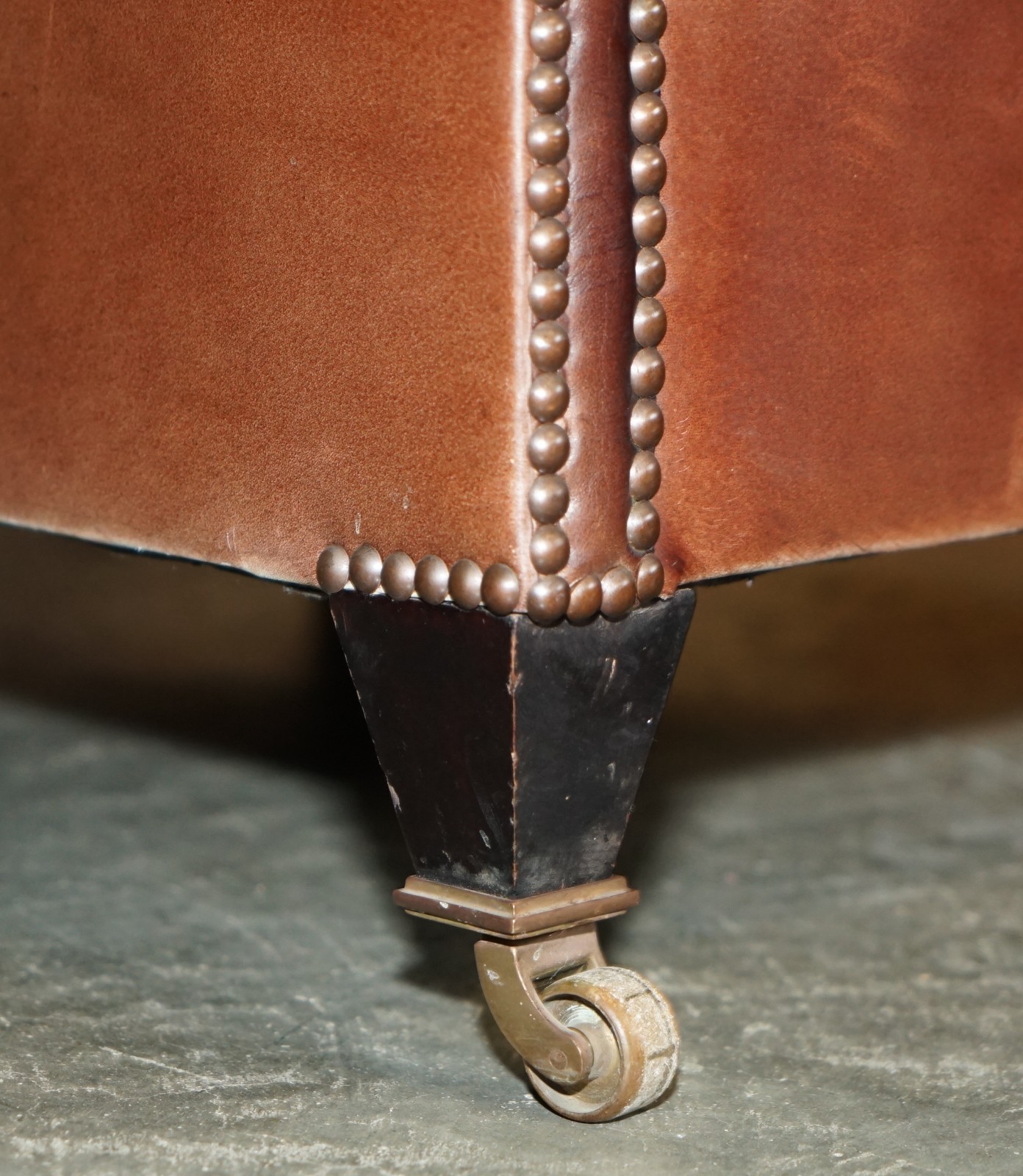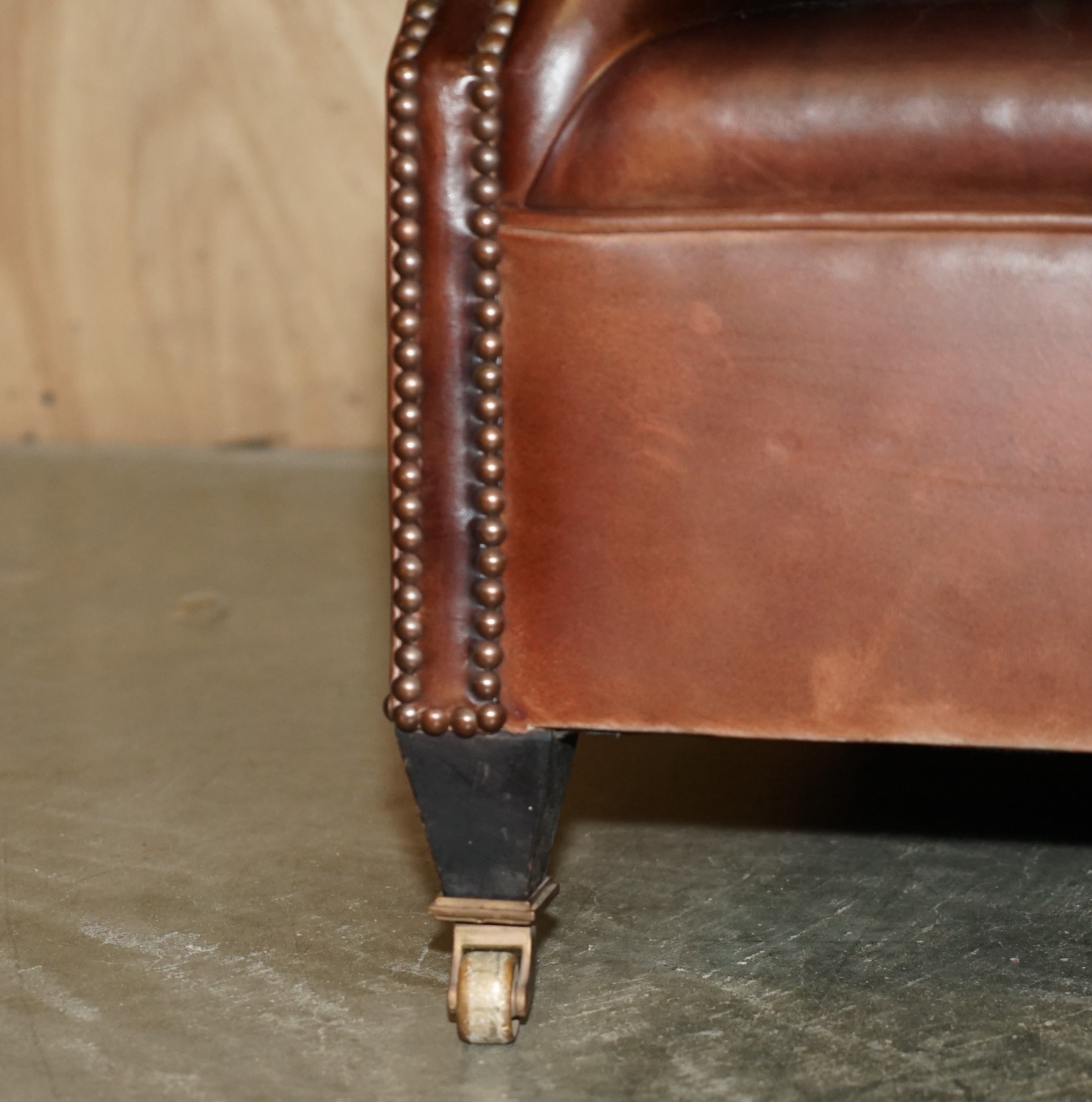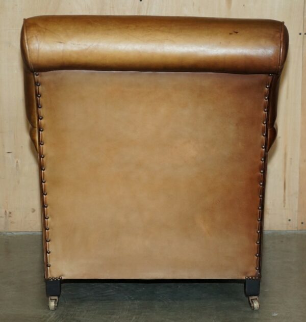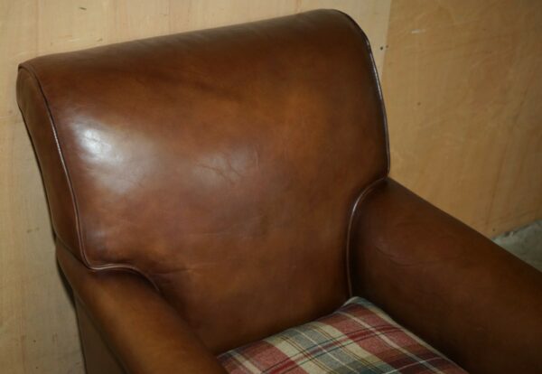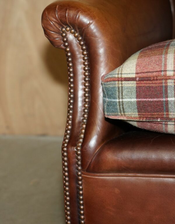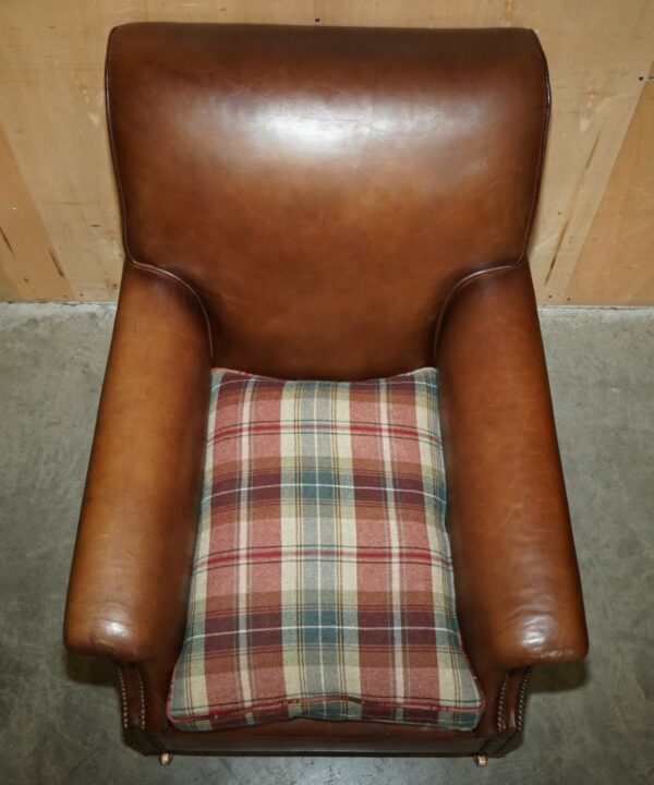 PAIR OF GEORGE SMITH BROWN LEATHER SIGNATURE SCROLL TARTAN CUSHIONS ARMCHAIRS
