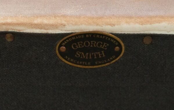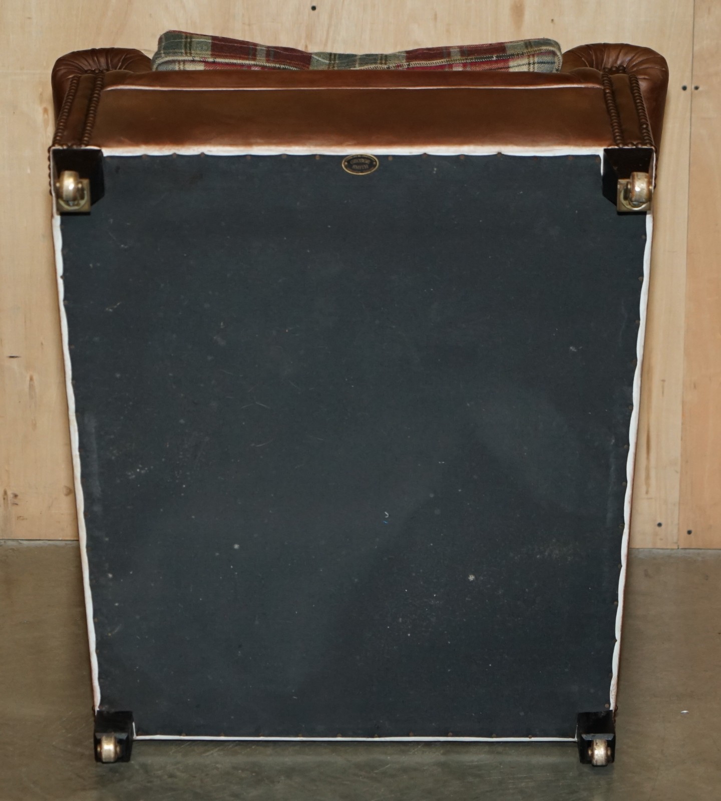 Royal House Antiques is delighted to offer for sale this stunning original pair of George Smith Signature Scroll arm armchairs in brown leather with Scottish Tartan wool upholstered overstuff feather filled cushions which are part of a suite