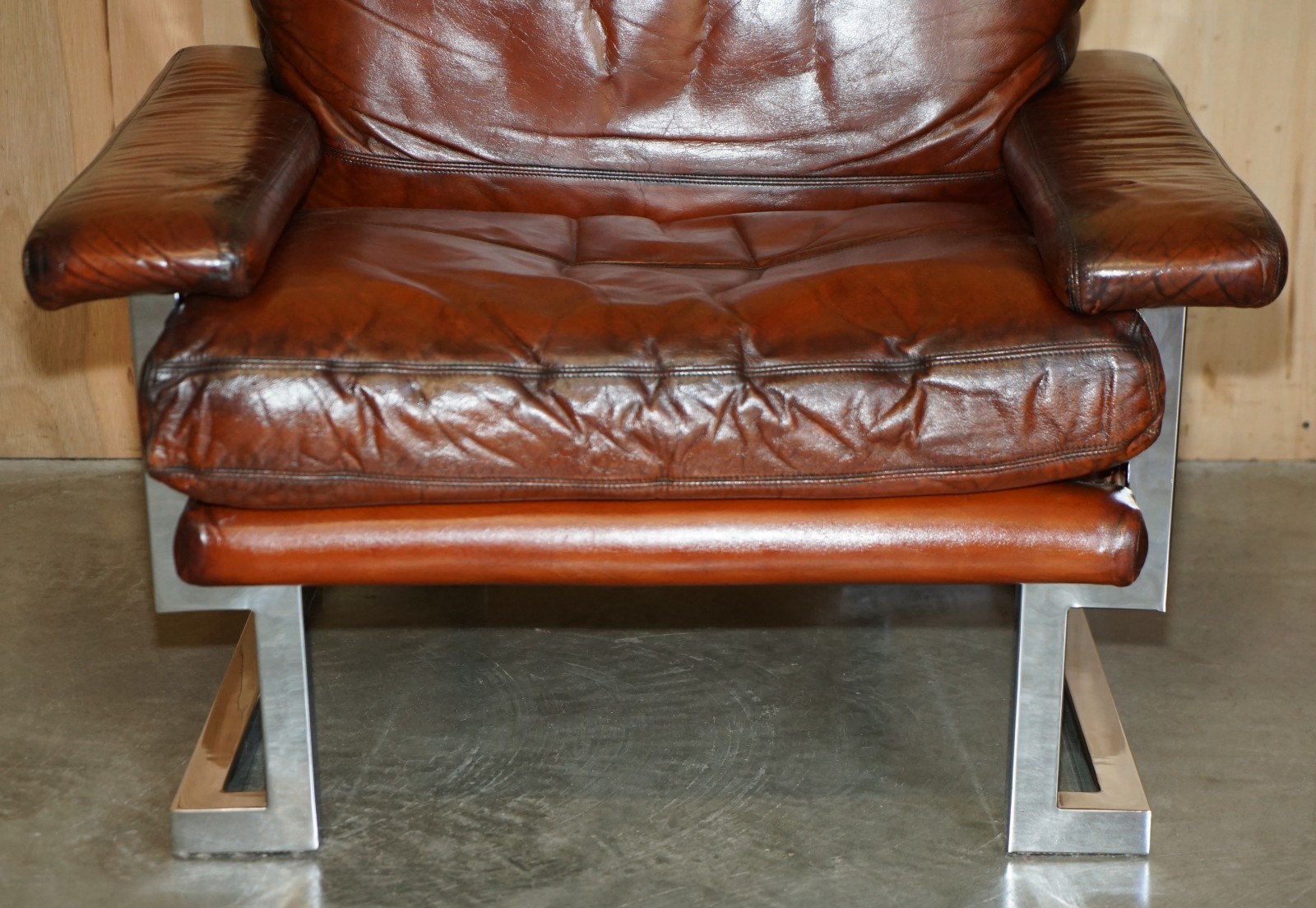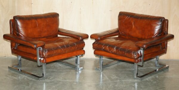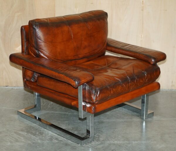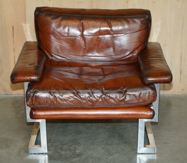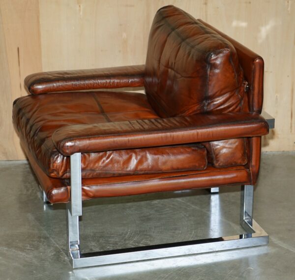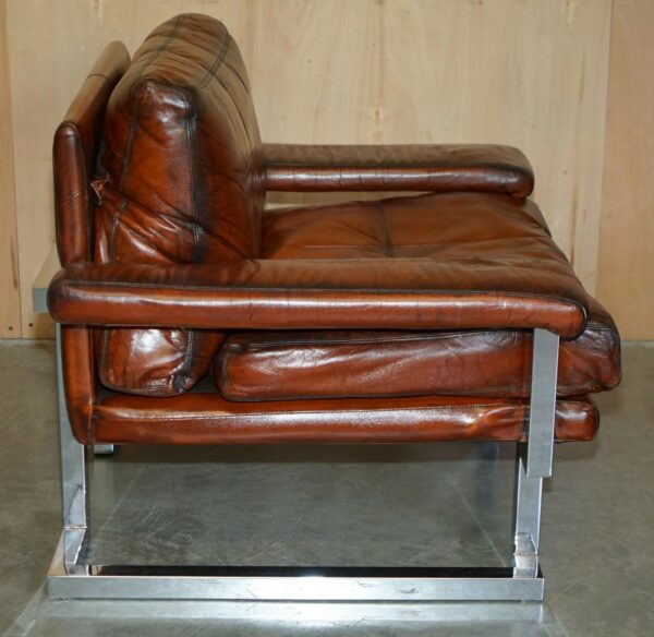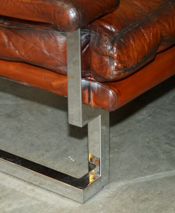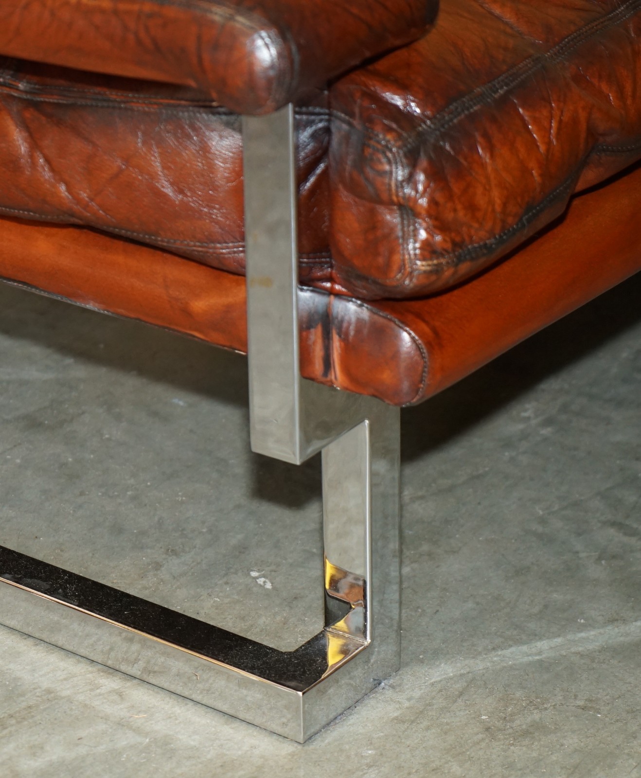 The suite has been fully restored to have all the chrome professionally polished, the leather has been washed back, hand dyed six times, antiqued, sealed waxed down and polished, it is in perfect MCM condition throughout
